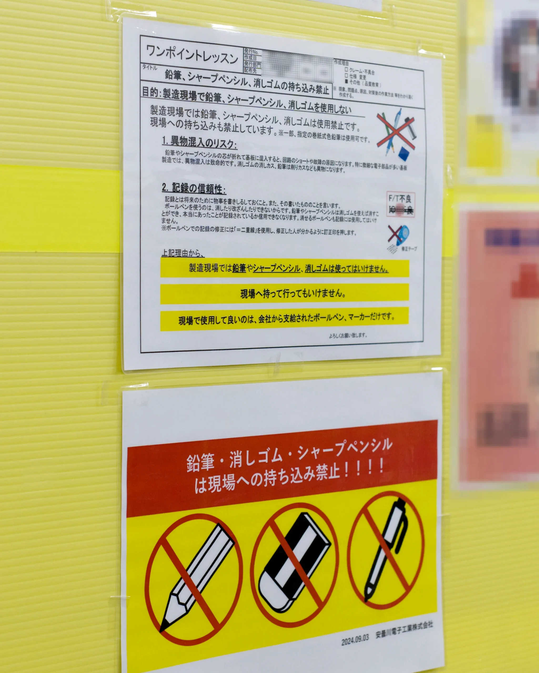 ものごとには理由があります。製造現場でなぜ鉛筆、シャープペンシル、消しゴムを使ってはいけないのか、その理由やリスクも明記します。