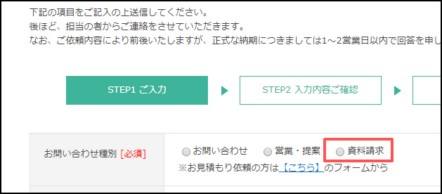 2.下記画面を参照し、お問い合わせ種別『資料請求』をクリックします。
