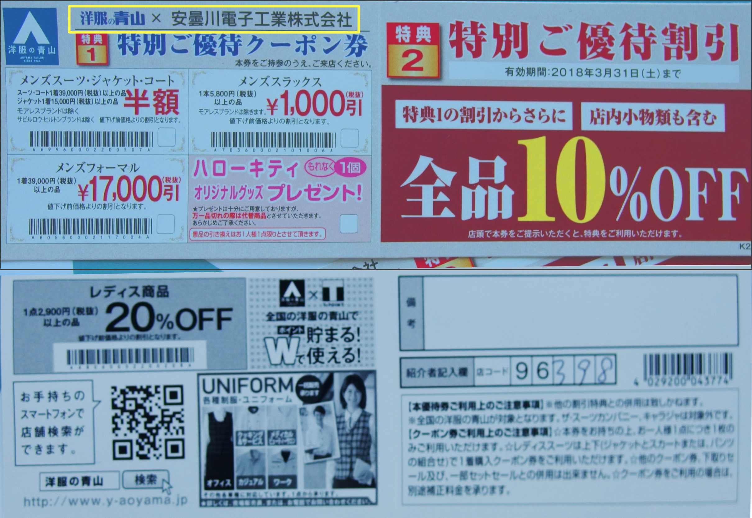 洋服の青山全店で使用できるお得な割引券3枚セットを全員へプレゼント!