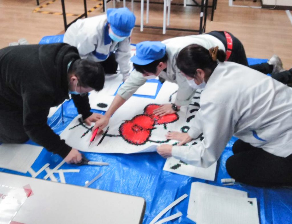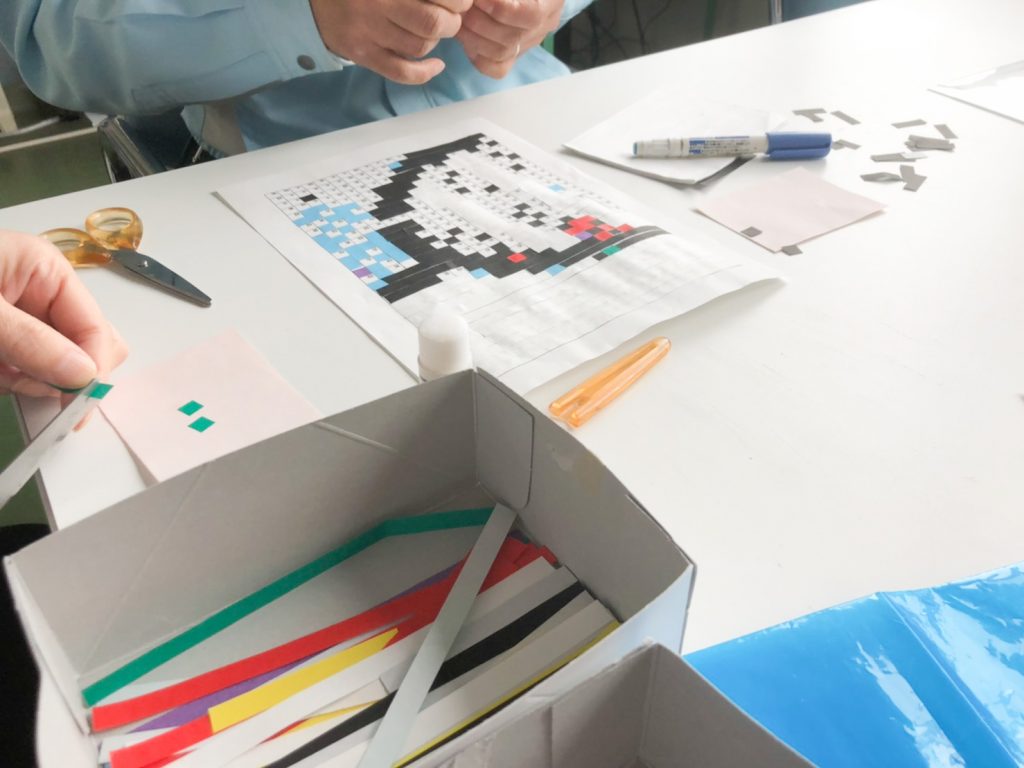 職場委員会では、折り紙を9mm平方に切り、貼り合わせていくことにしました。