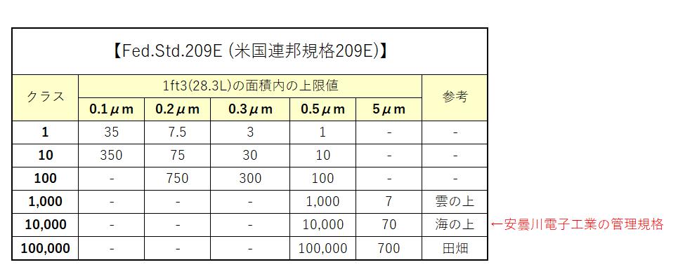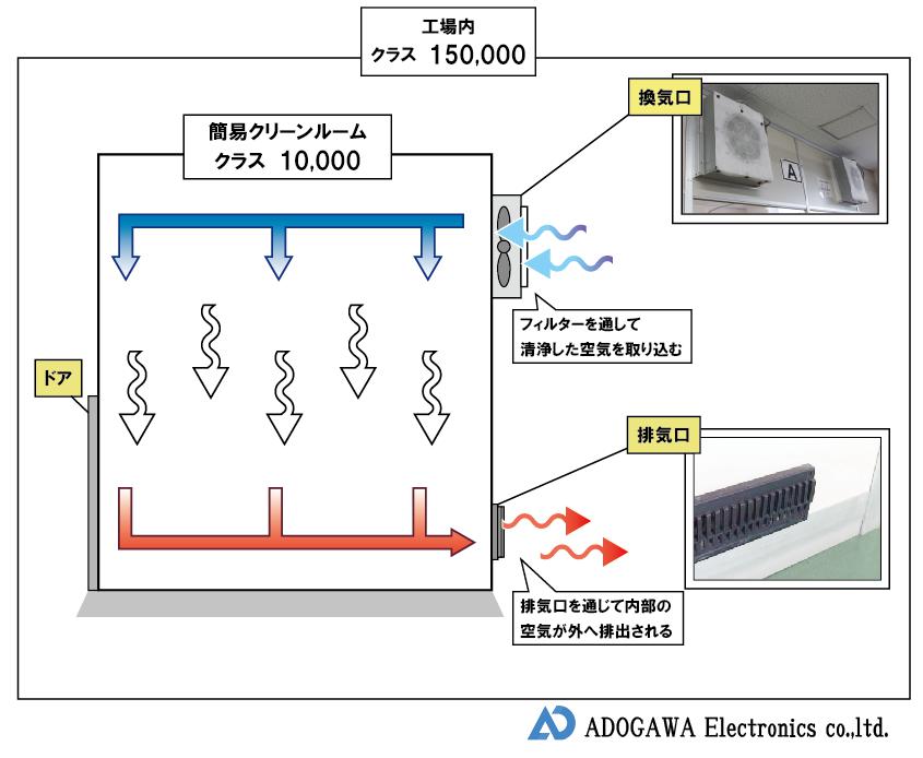 社内設備ページでもご紹介していますが、安曇川電子工業では【Fed.Std.209E (米国連邦規格209E)】の規格下でクラス10,000レベルの清浄度を保った「簡易クリーンルーム」を設けています。