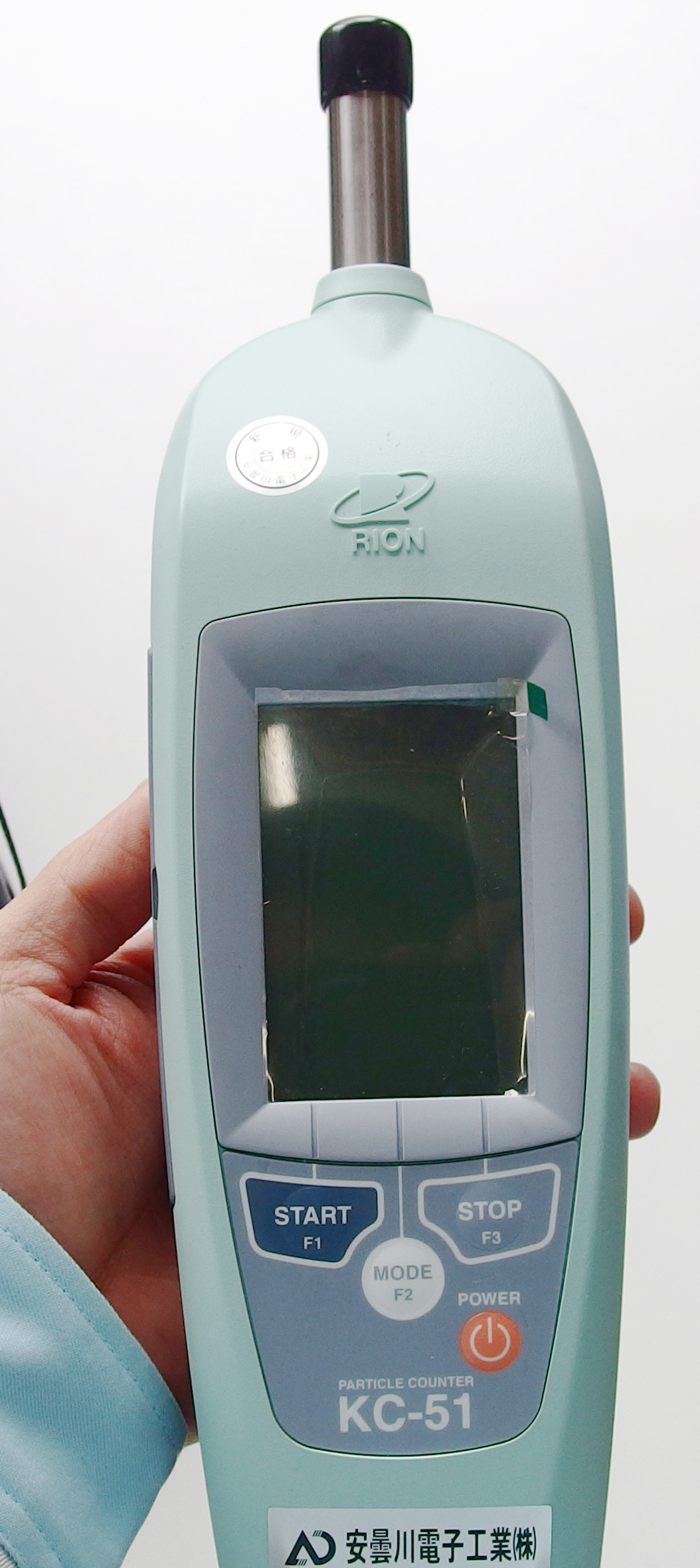 ↑安曇川電子工業の簡易クリーンルームのしくみ ■クリーンルームのクラスと測定 これらの測定にはハンドヘルドパーティクルカウンター[KC-51]を用いて測定しています。 ■ハンドヘルドパーティクルカウンタ[KC-51](リオン株式会社製)