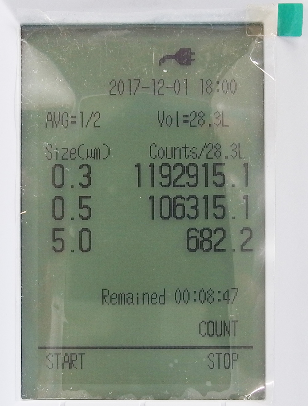 これらをハンドヘルドパーティクルカウンタを用いて測定すると、液晶に以下のような測定結果が表示されます。 これが基準以内に入っているかどうかでクラスを判定し、常に清浄度を保っているというわけですね。