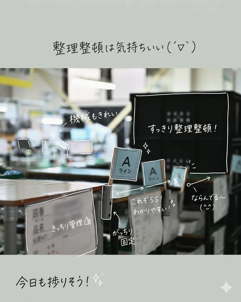 当社は、改善(5S)の目的を「会社のため」から「作業者自身が楽になるため」へと再定義しました。そのうえで、ものの配置基準と可視化を導入し、5S管理者を設けなくても5Sが維持される自律型の現場づくりにつなげています。この記事では、当社が実践する「3S(整理・整頓・清掃)なくして5Sならず」という思想に基づき、その具体的な手法を共有します。