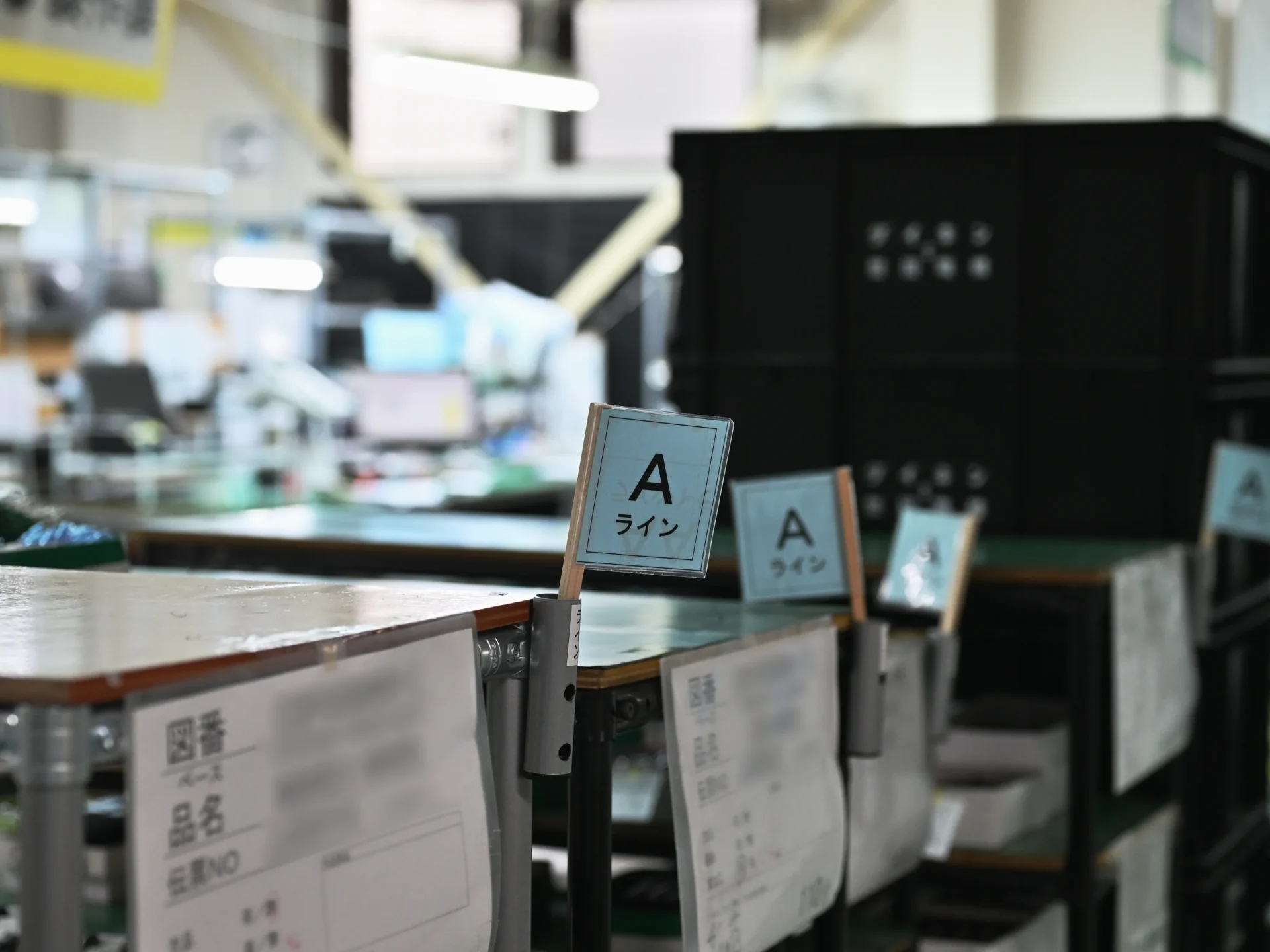 ひと目で判断できる、製造ライン名を記した「ラインフラッグ」の設置や、資材置き場、通路などの区画線ルールを徹底します。これにより、見渡すだけで異常(平常と異なる状況)が判断できます。