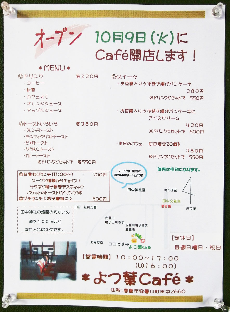 今回は久しぶりに地域に関するブログです。(๑>◡<๑) 先週10月9日(火)に会社の駐車場横にオープンしたよつ葉Cafe様へランチに行ってきました!