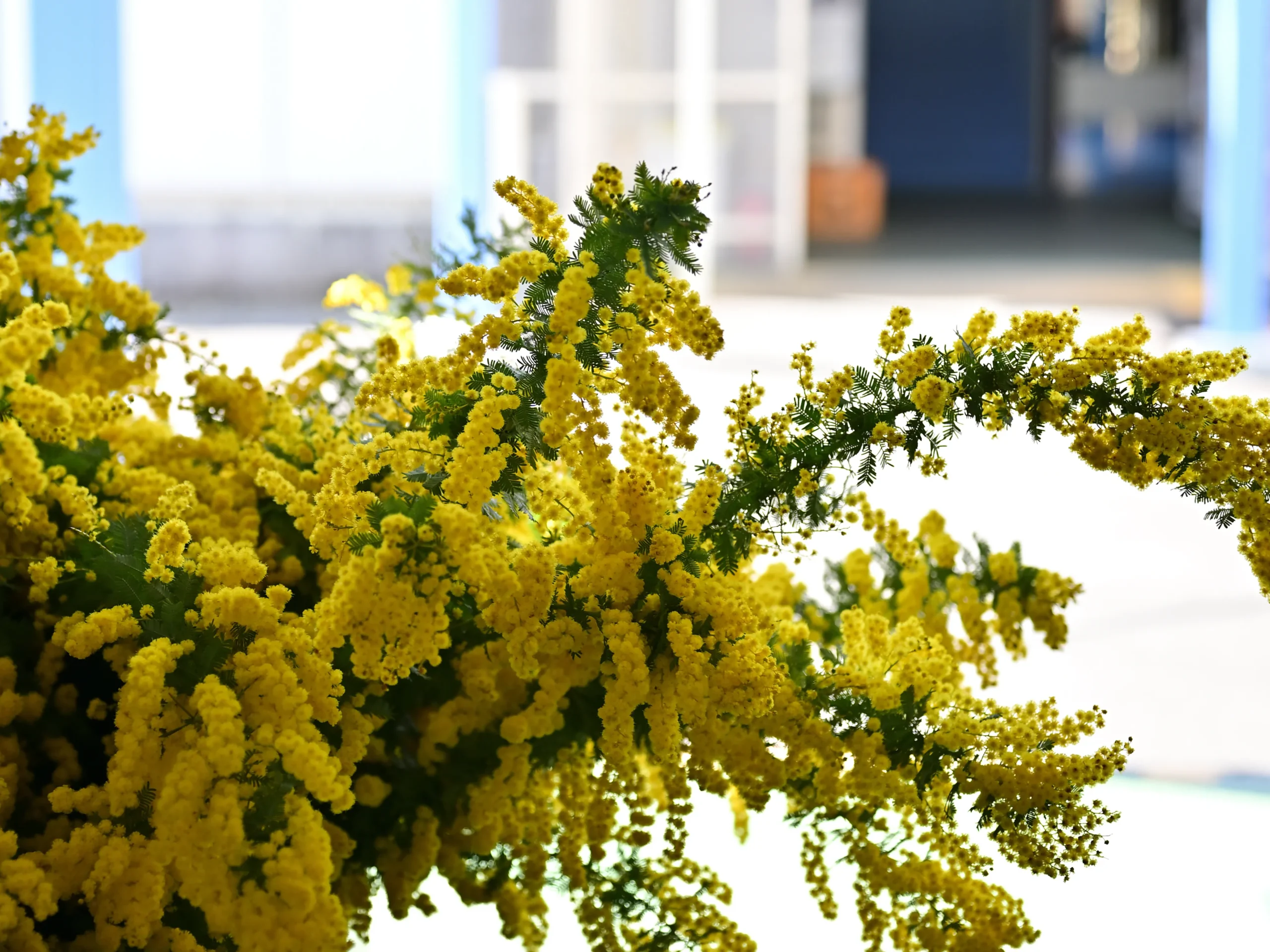 春先には、シルバーリーフ(銀色がかった葉)のミモザ(アカシア)が、太陽のような鮮やかな黄色い花を咲かせ、訪れる人の目を楽しませます。