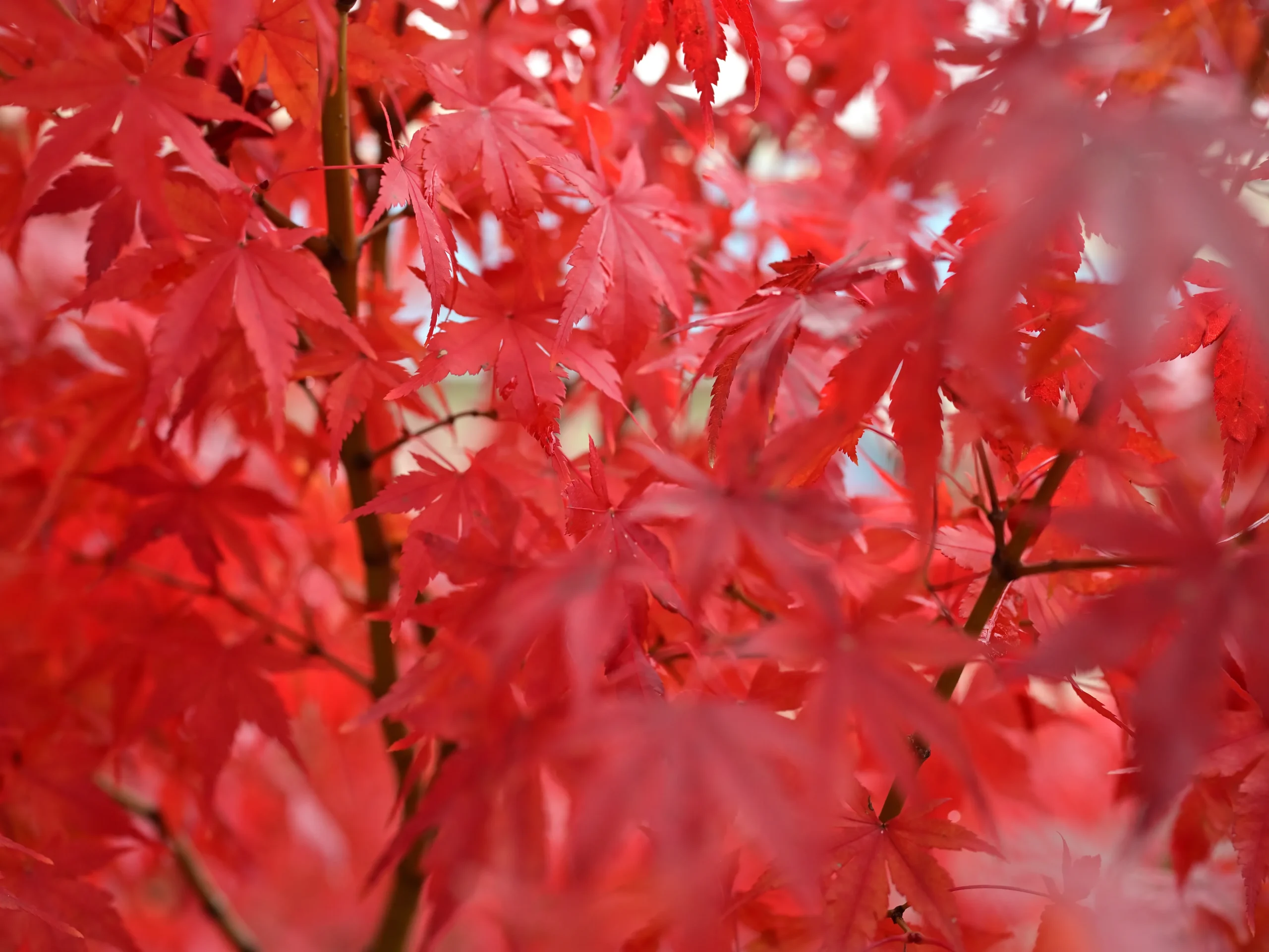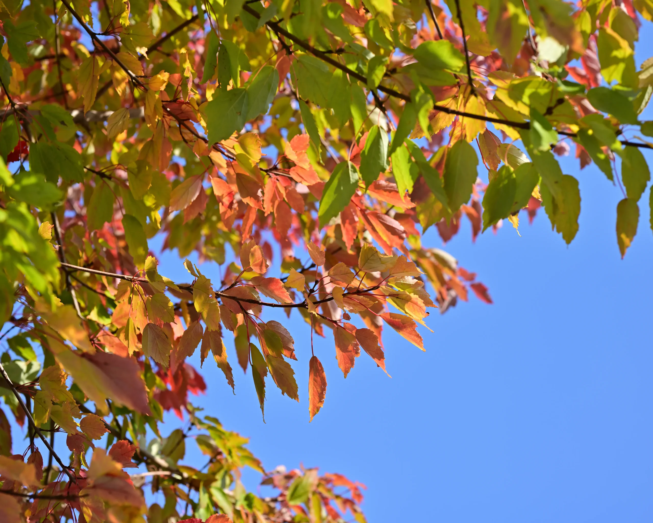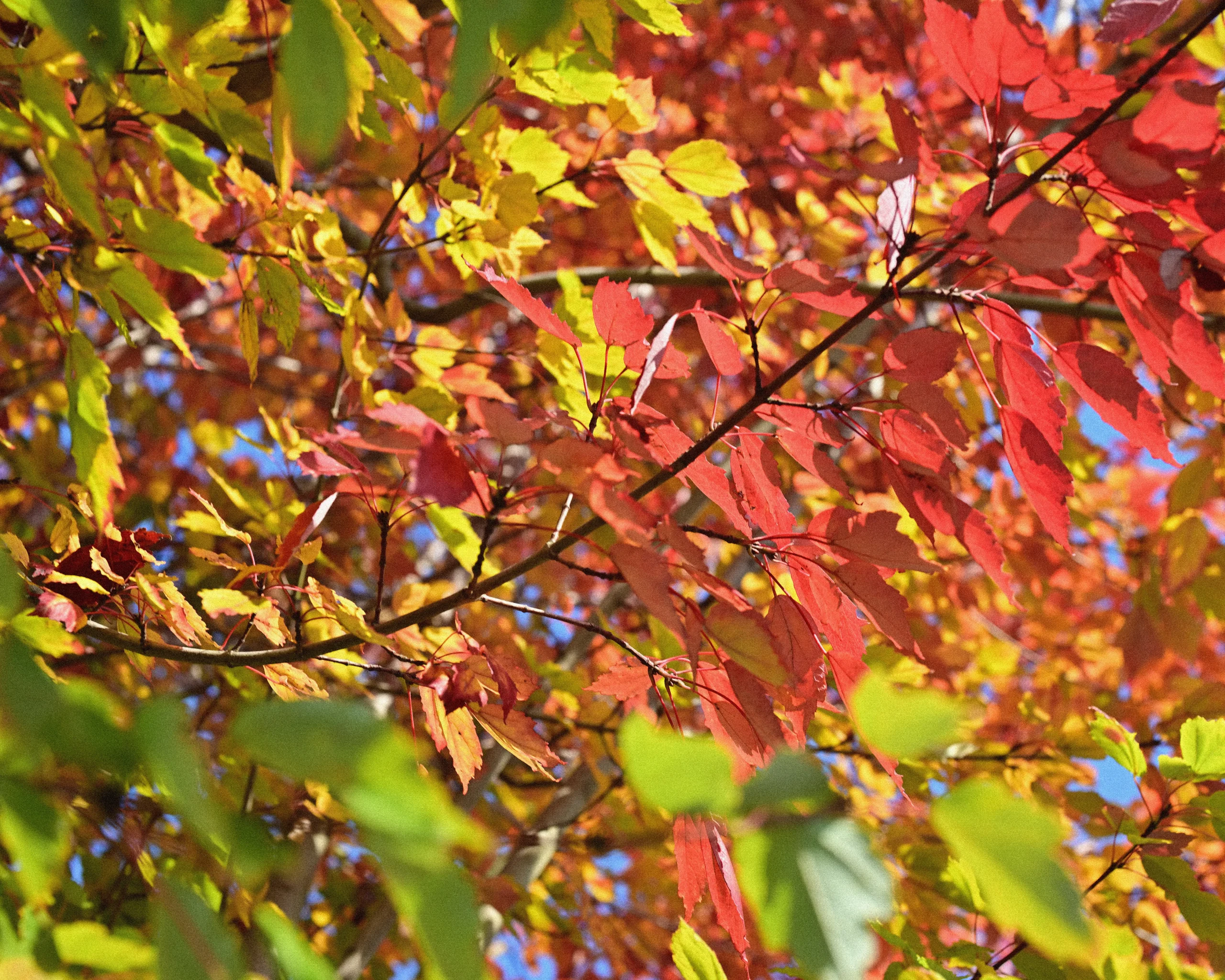 一本の樹のなかに、秋が織りなすグラデーション(階調)が見えます。紅に染まる葉があれば、青々とした葉も残ります。
