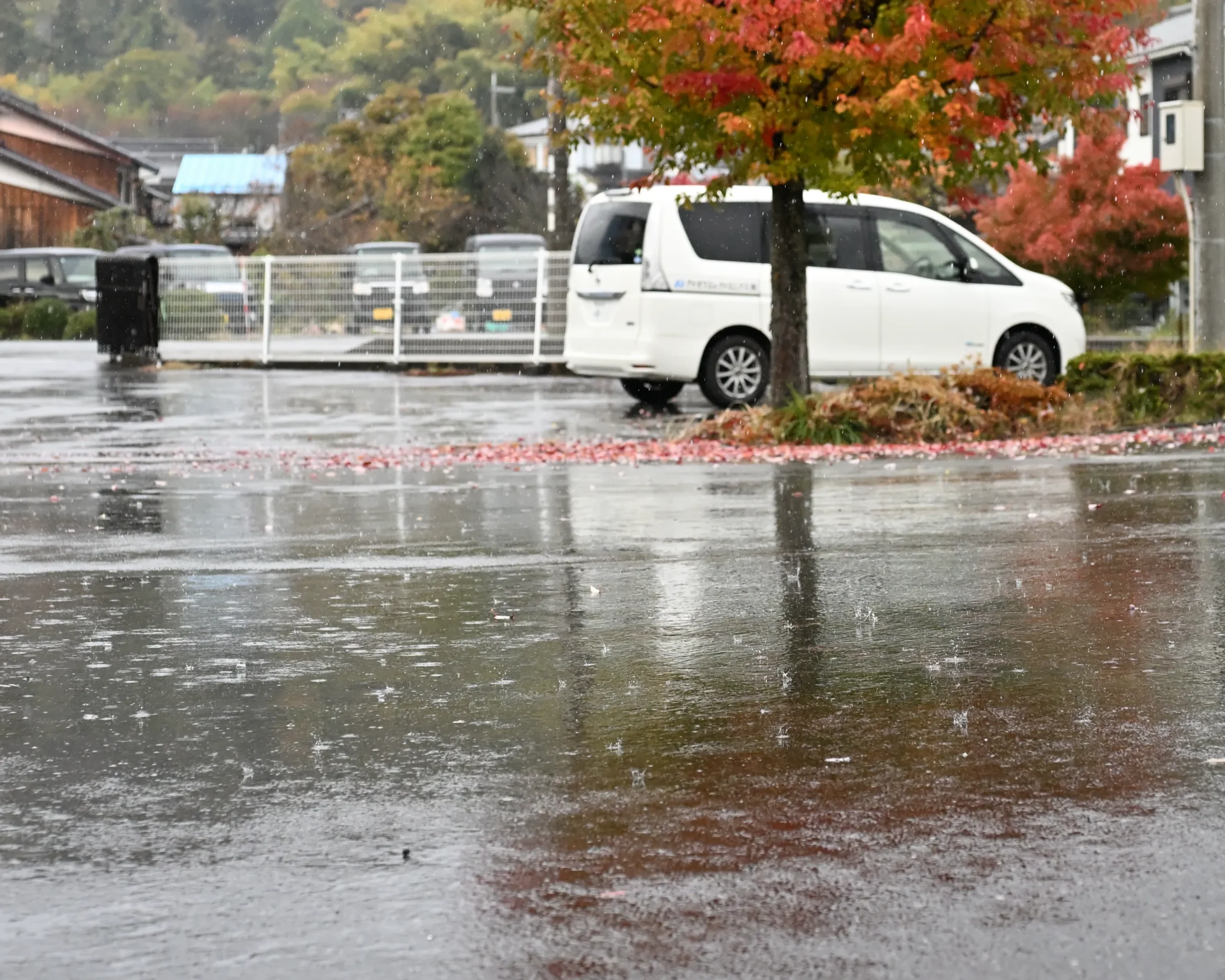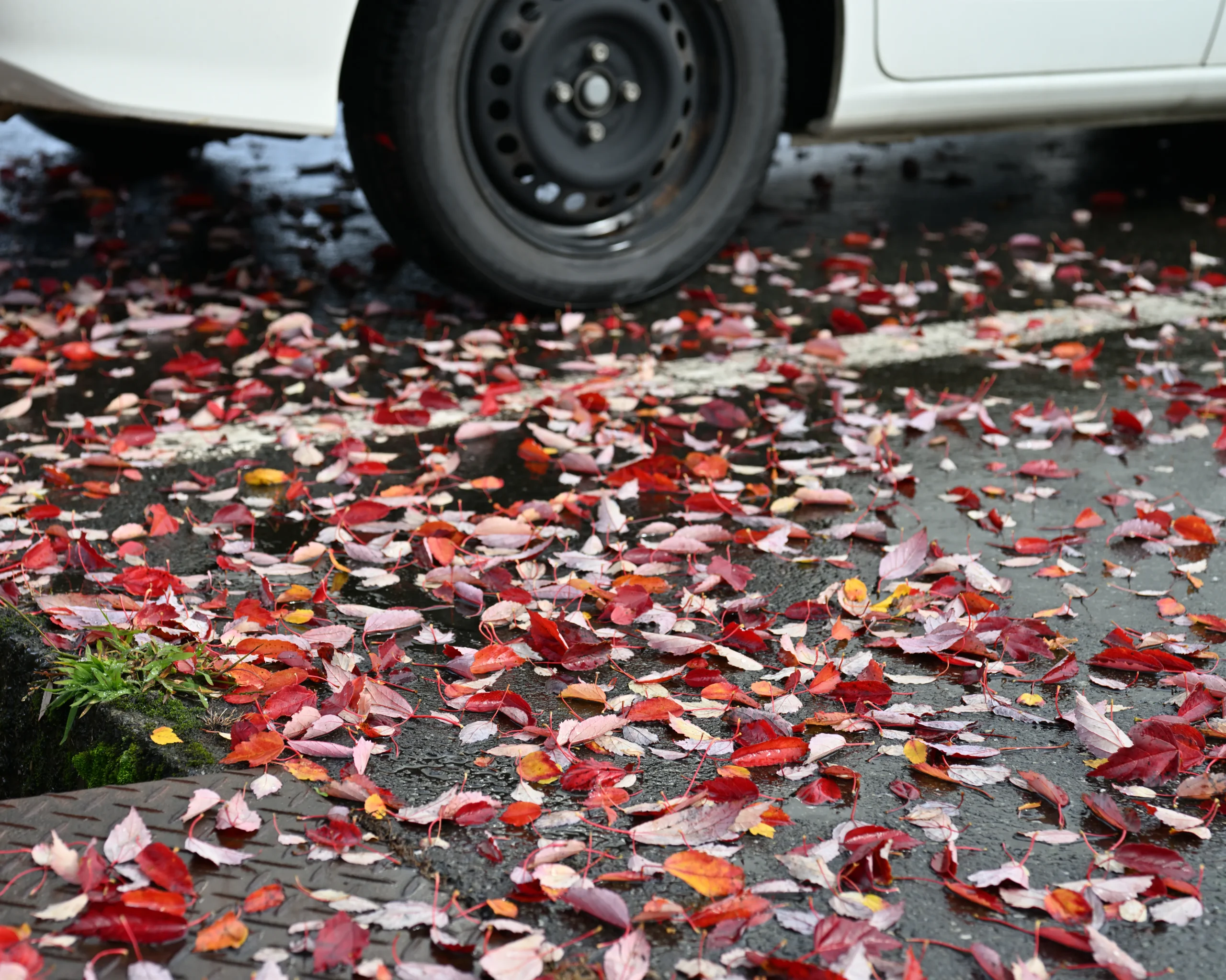 目線が紅葉を目当てに高くなりますが、今朝のような雨上がりの水たまりには、赤、白、黄色の落ち葉が映り込み、まるで色彩豊かなモザイク画のように幻想的な景色を生み出しています。