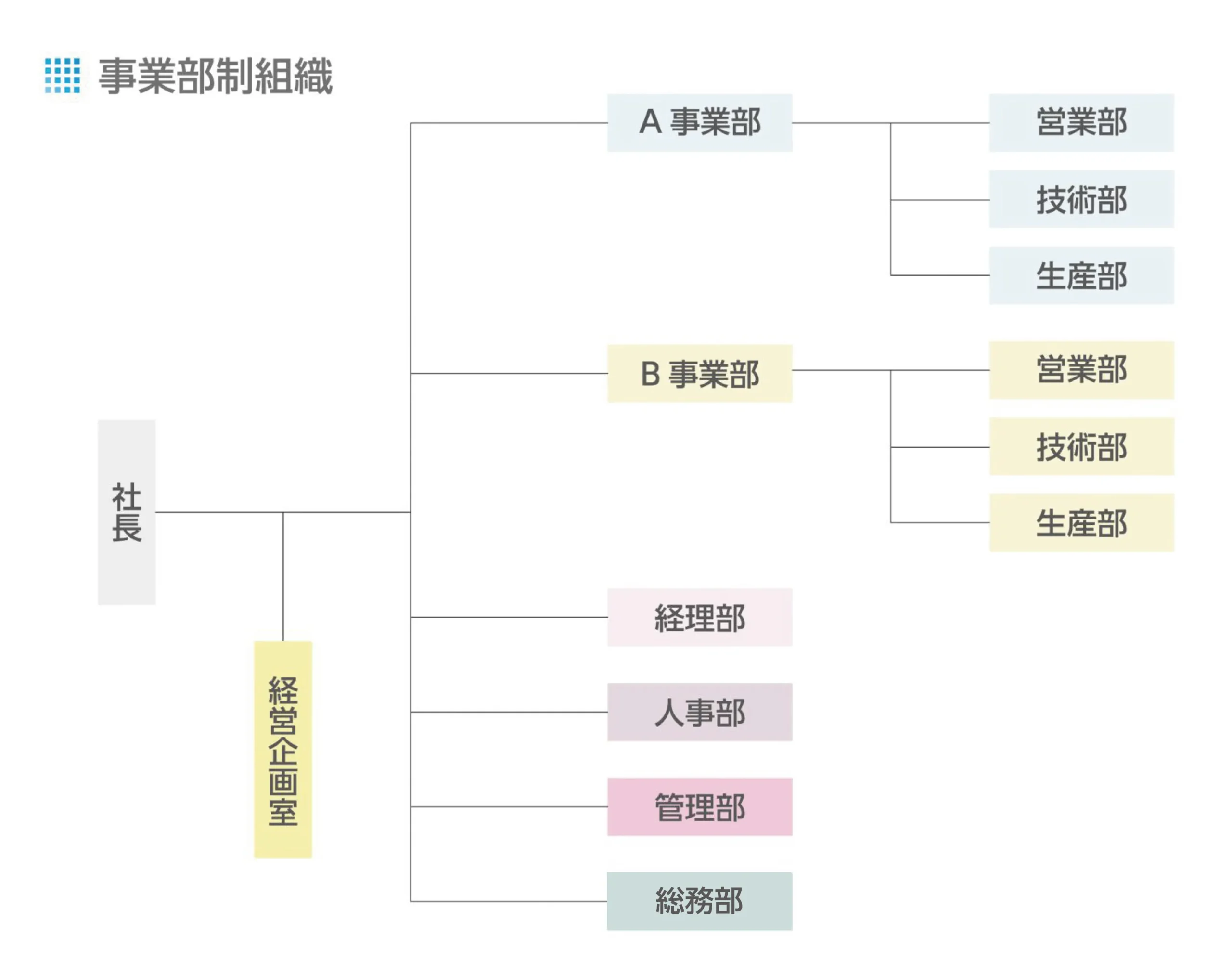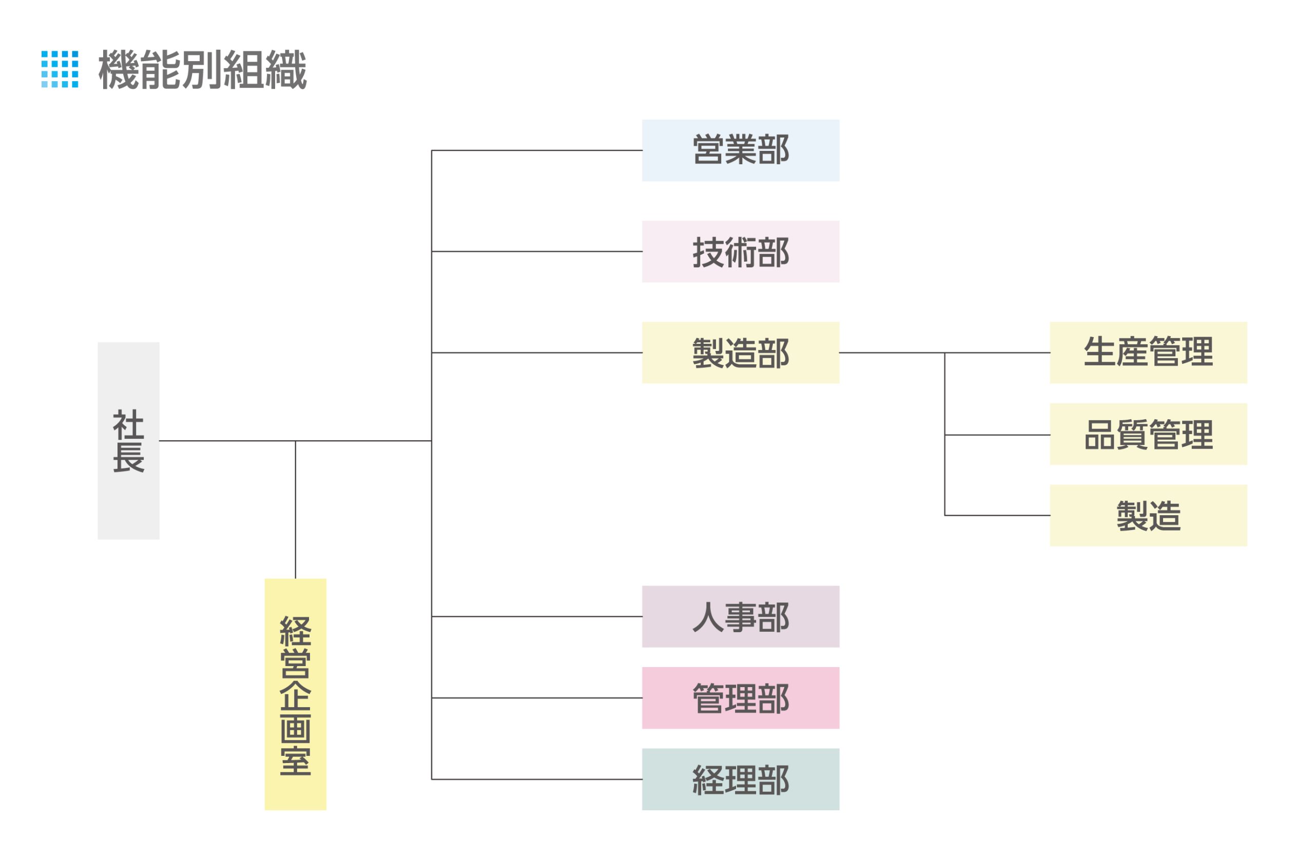営業部、技術部、製造部などの機能別の組織形態。機能(役割)別の専門知識、技能を身につけやすい一方で、企業経営の視点や知識、経験を備えた人材が育ちにくい。