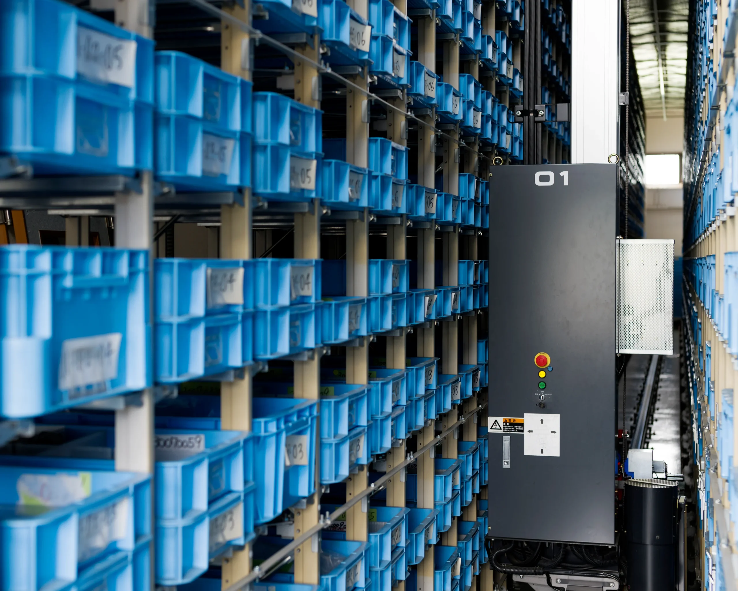 少量多品種の不定形な製品や部品を、樹脂コンテナの単位で入庫、保管、出庫する自動倉庫です。