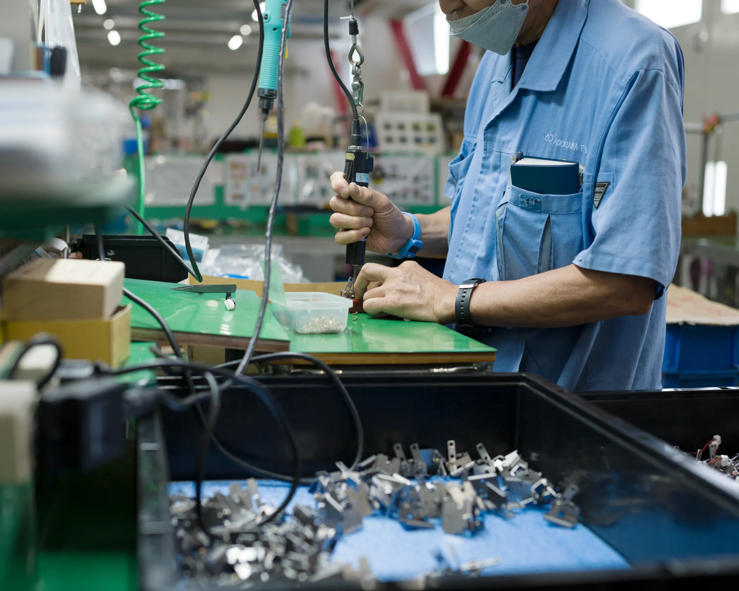 安曇川(あどがわ)電子工業です。プリント基板・部品調達〜基板実装、電気機械器具組立まで、関西・近畿一拠点で一貫生産体制を整えています。製造工程を当社にお任せいただくことで、お客さまの有限資源(ヒト、モノ、カネ、トキ)を、企画や開発、設計などの中核能力に集中していただけます。
