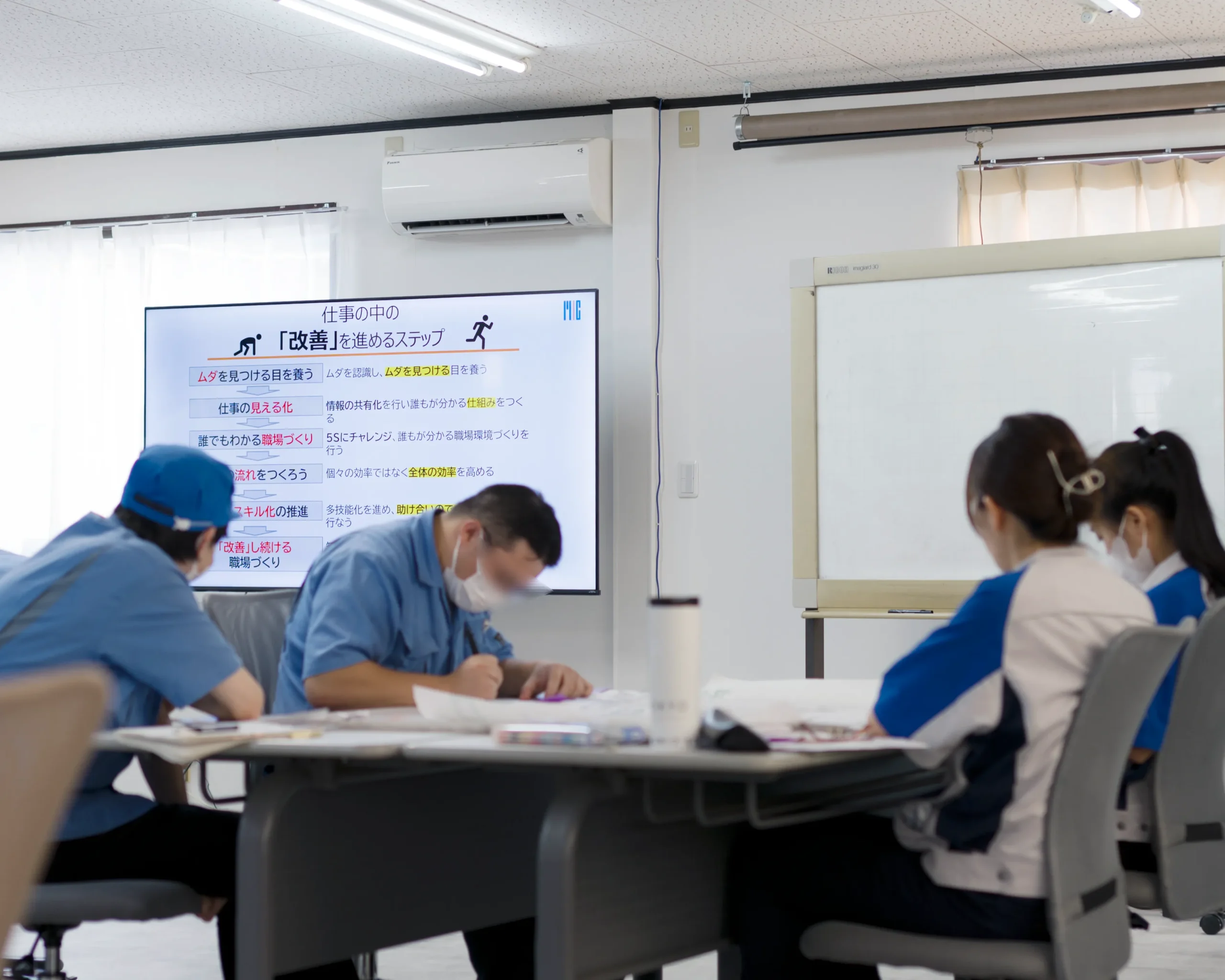 滋賀県産業支援プラザが提供する『現場管理者向け講座』を、複数の企業が一緒になって受講しています。