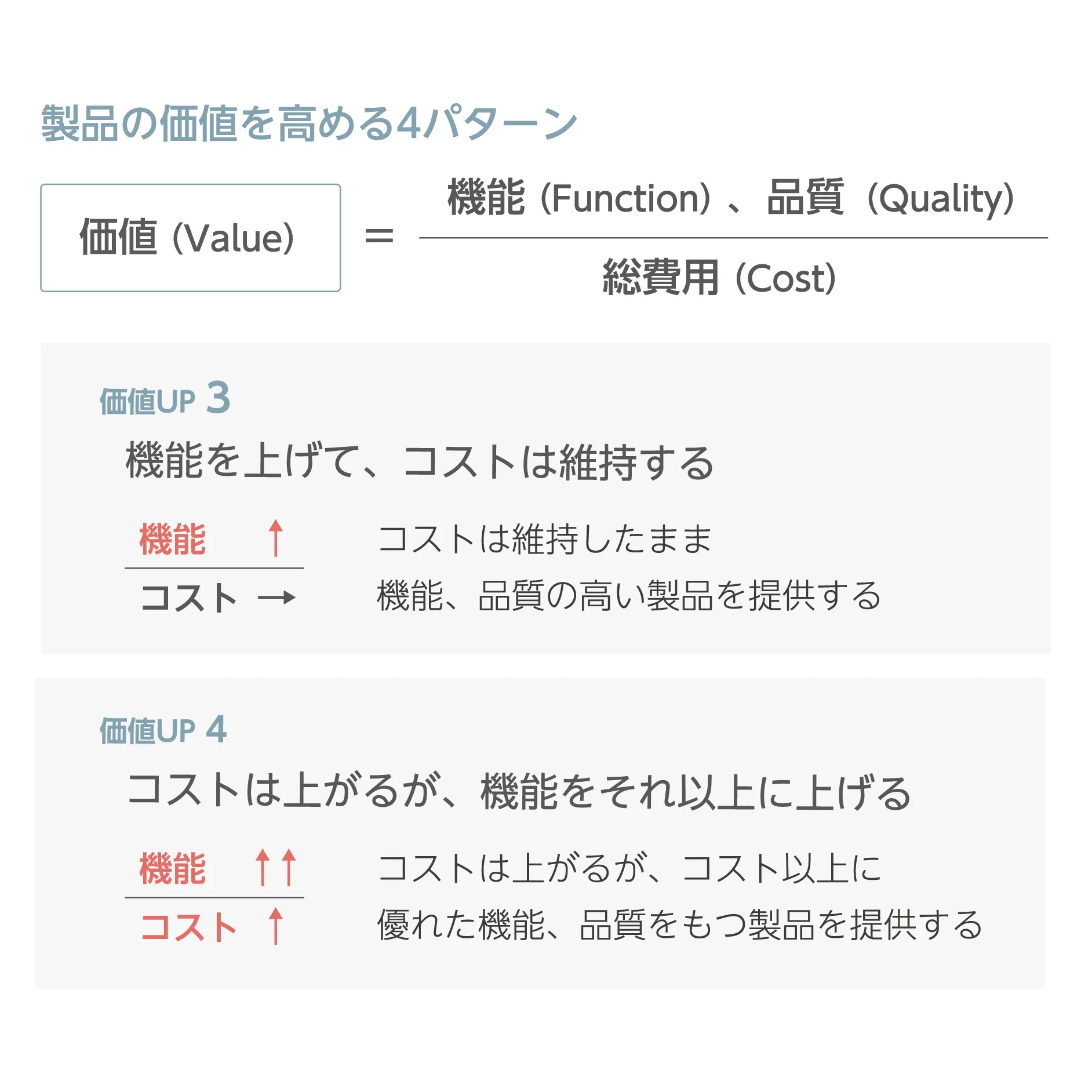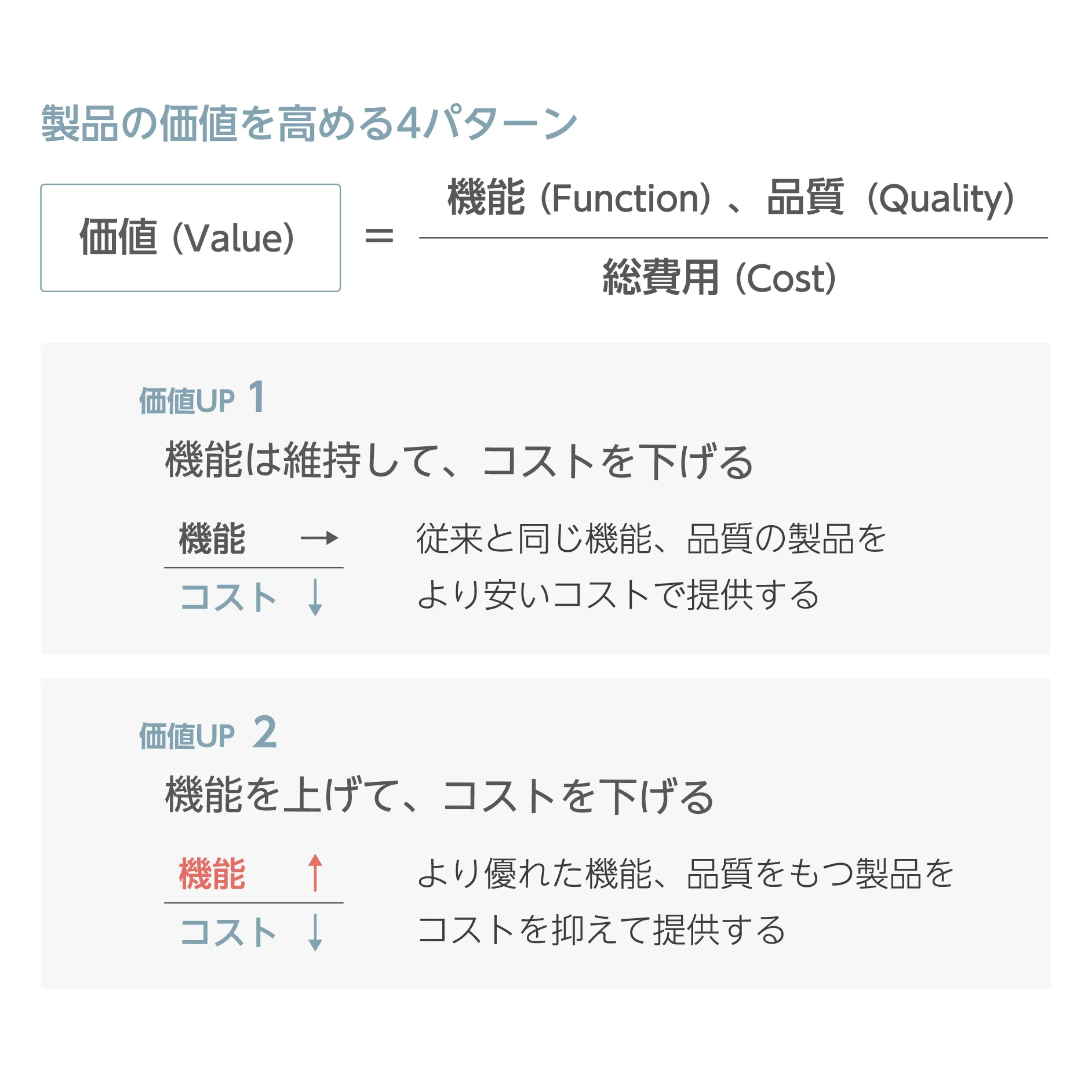 製品の価値は、お客さまが求められる品質や機能を、最小の費用(ライフサイクルコスト)で達成することで高めます。