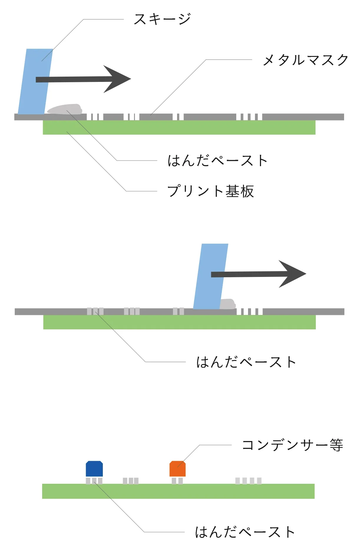 はんだペーストを指定位置に印刷するために欠かせません。印刷方法はまるで版画のようです。