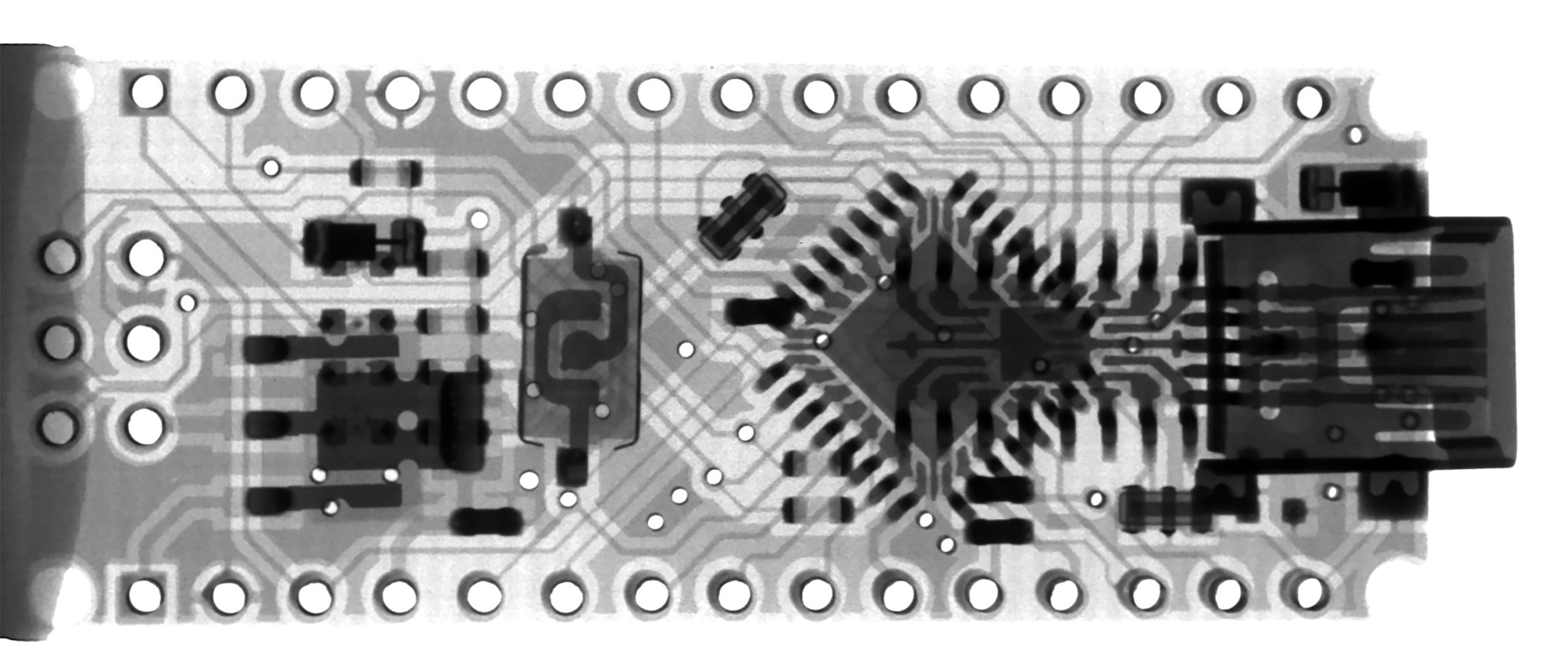 多層基板の層間導通用スルーホールや(ミニ)バイアホールなどの穴で、基板製造で時間がかかる工程のひとつです。
