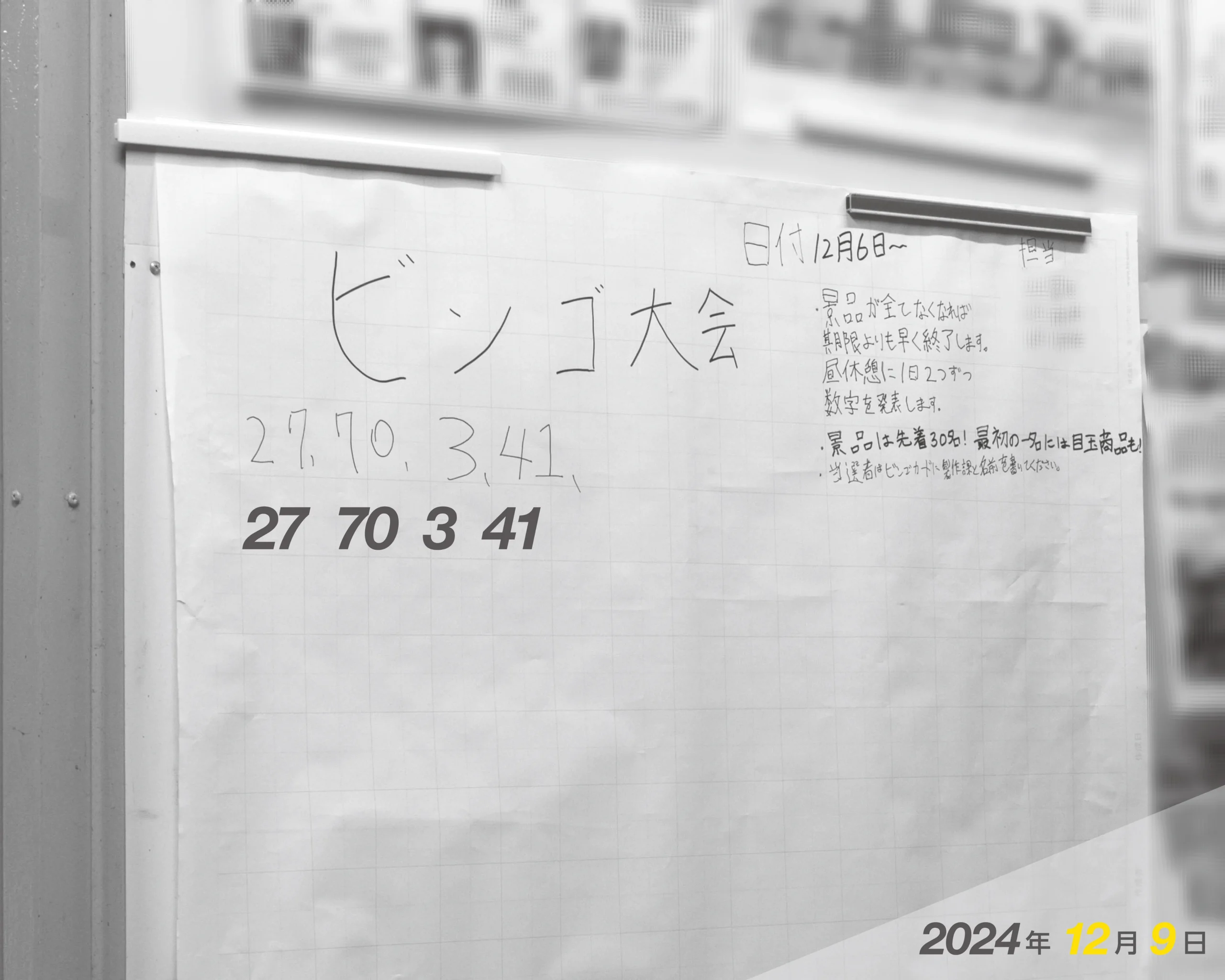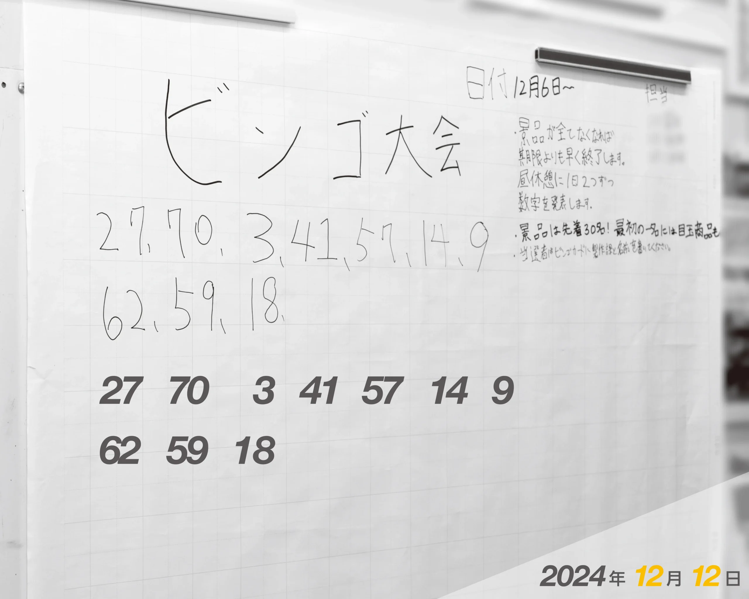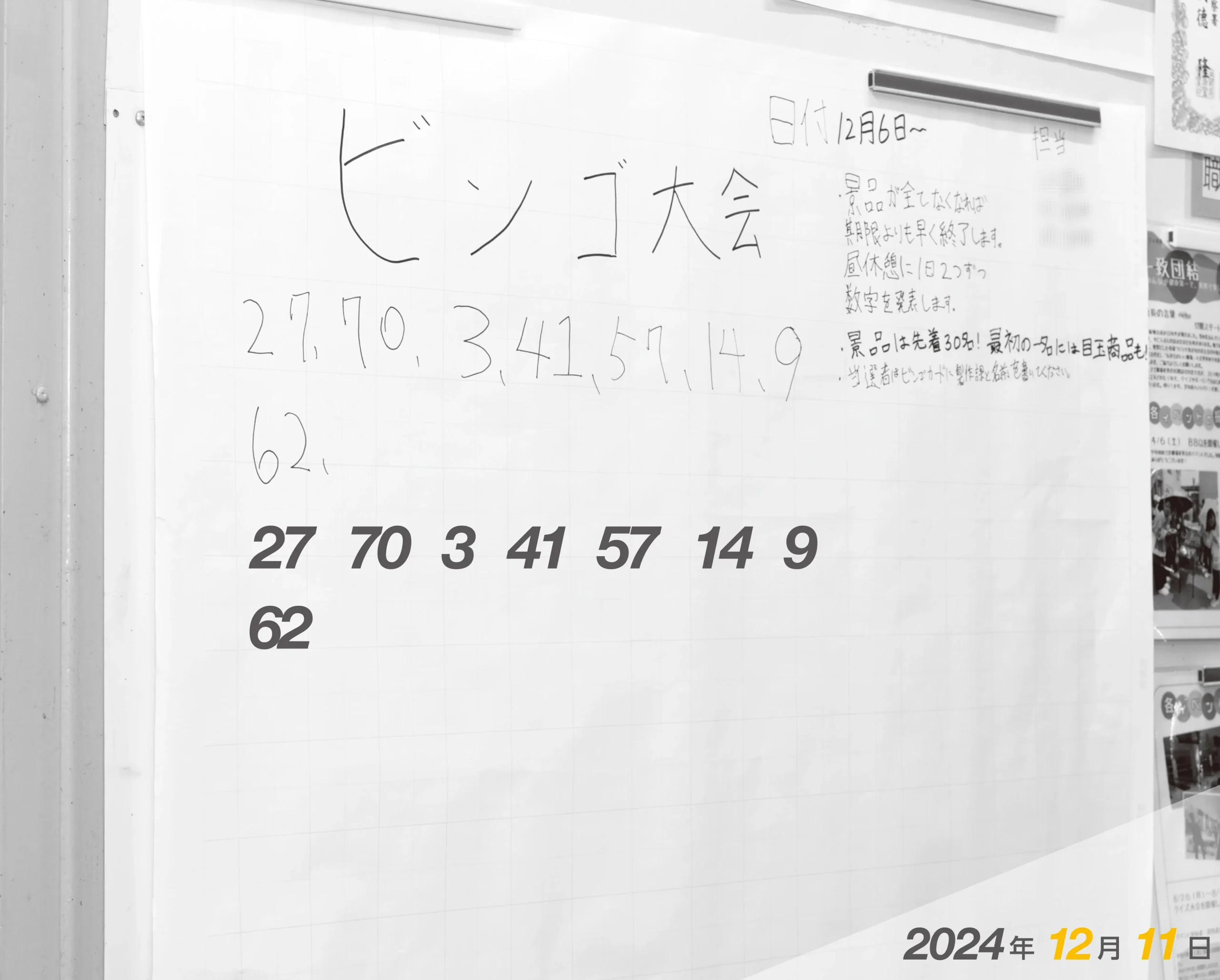 職場委員会が年末に毎年、ビンゴ大会を開催しています。昼休みに毎日、2つずつ抽せん数字が掲示されます。景品は、先着30人です。(4日目、2024/12/11)