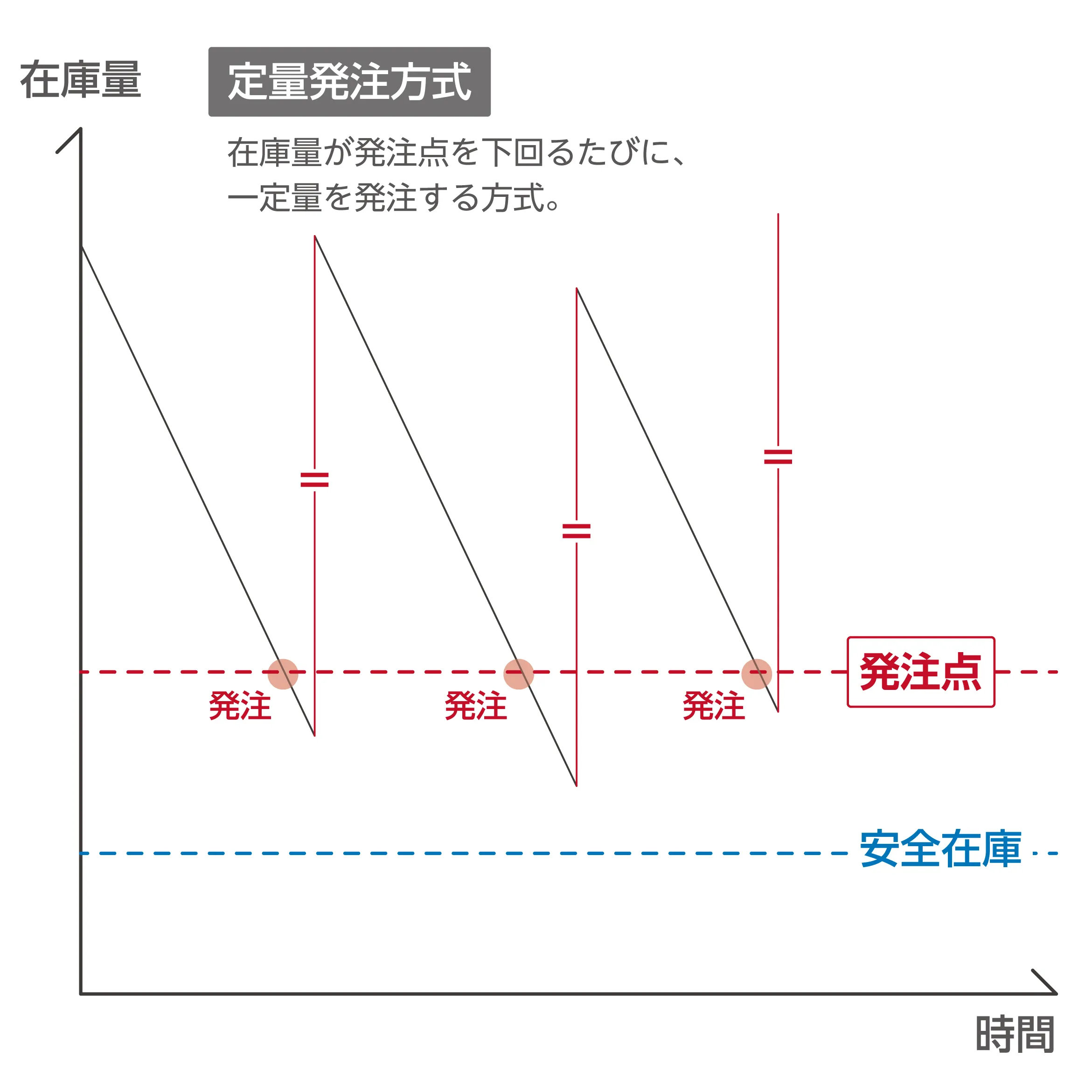 定量発注方式は、在庫量が発注点を下回るたびに一定量を発注する方式です。