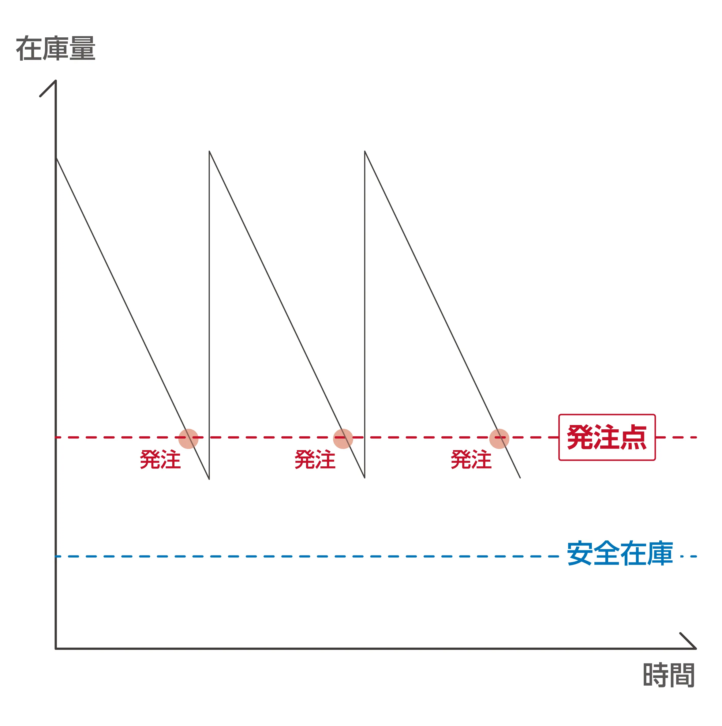 発注点は、再補充(発注)が必要となる在庫の最小数量です。(1日の)平均出庫数やリードタイム、安全在庫をもとに定めることで、発注業務の属人化、過剰在庫や欠品を防ぎます。