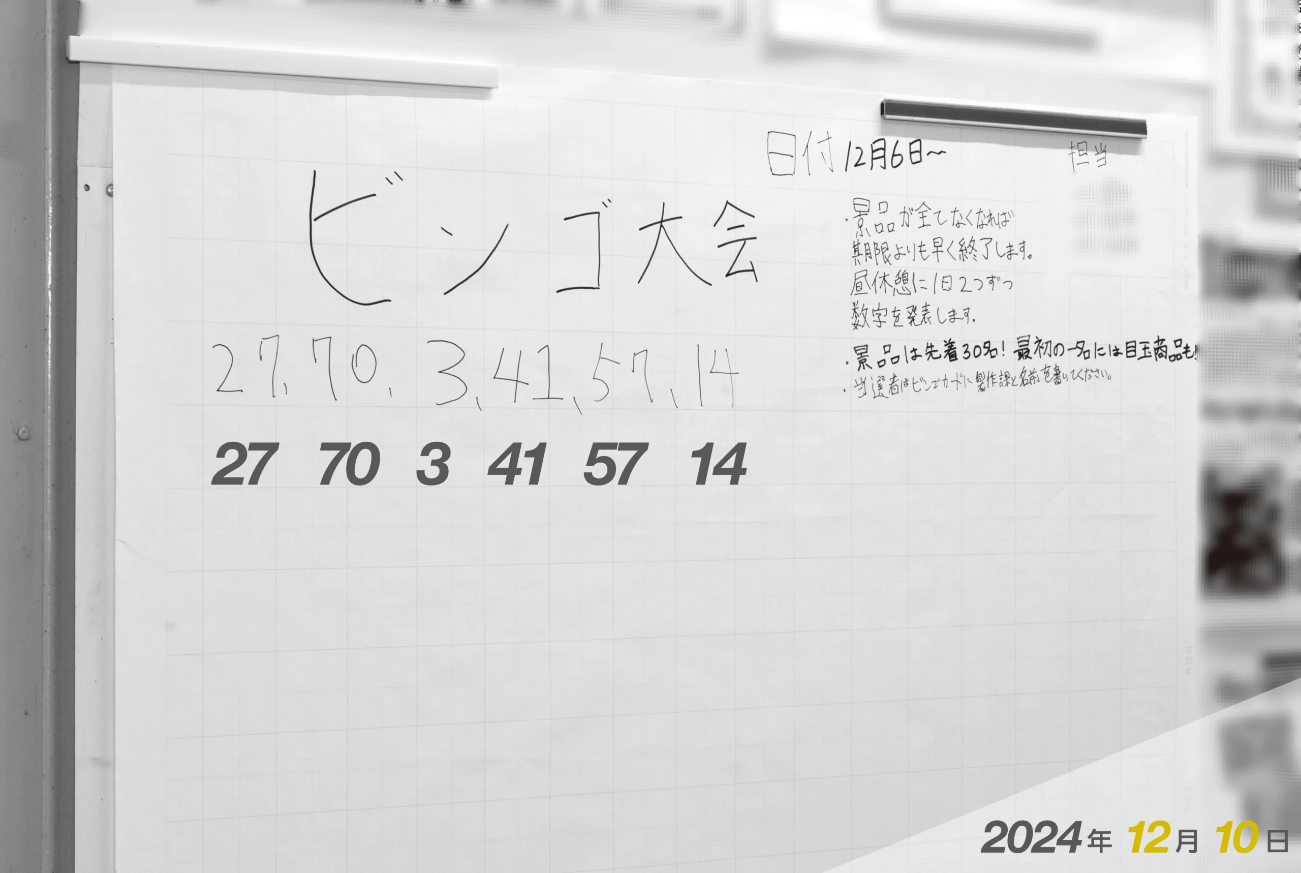 職場委員会が年末に毎年、ビンゴ大会を開催しています。昼休みに毎日、2つずつ抽せん数字が掲示されます。景品は、先着30人です。(3日目、2024/12/10)