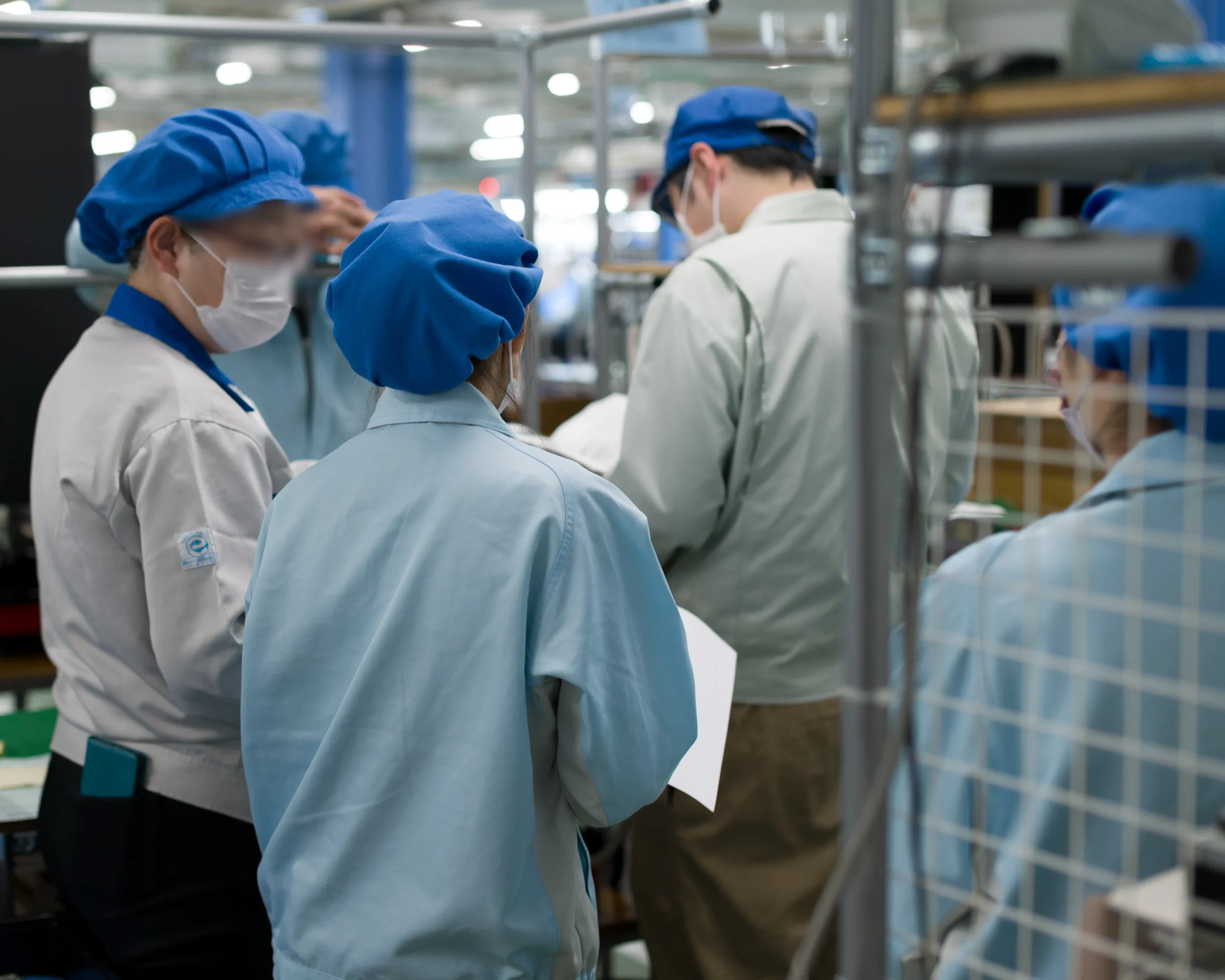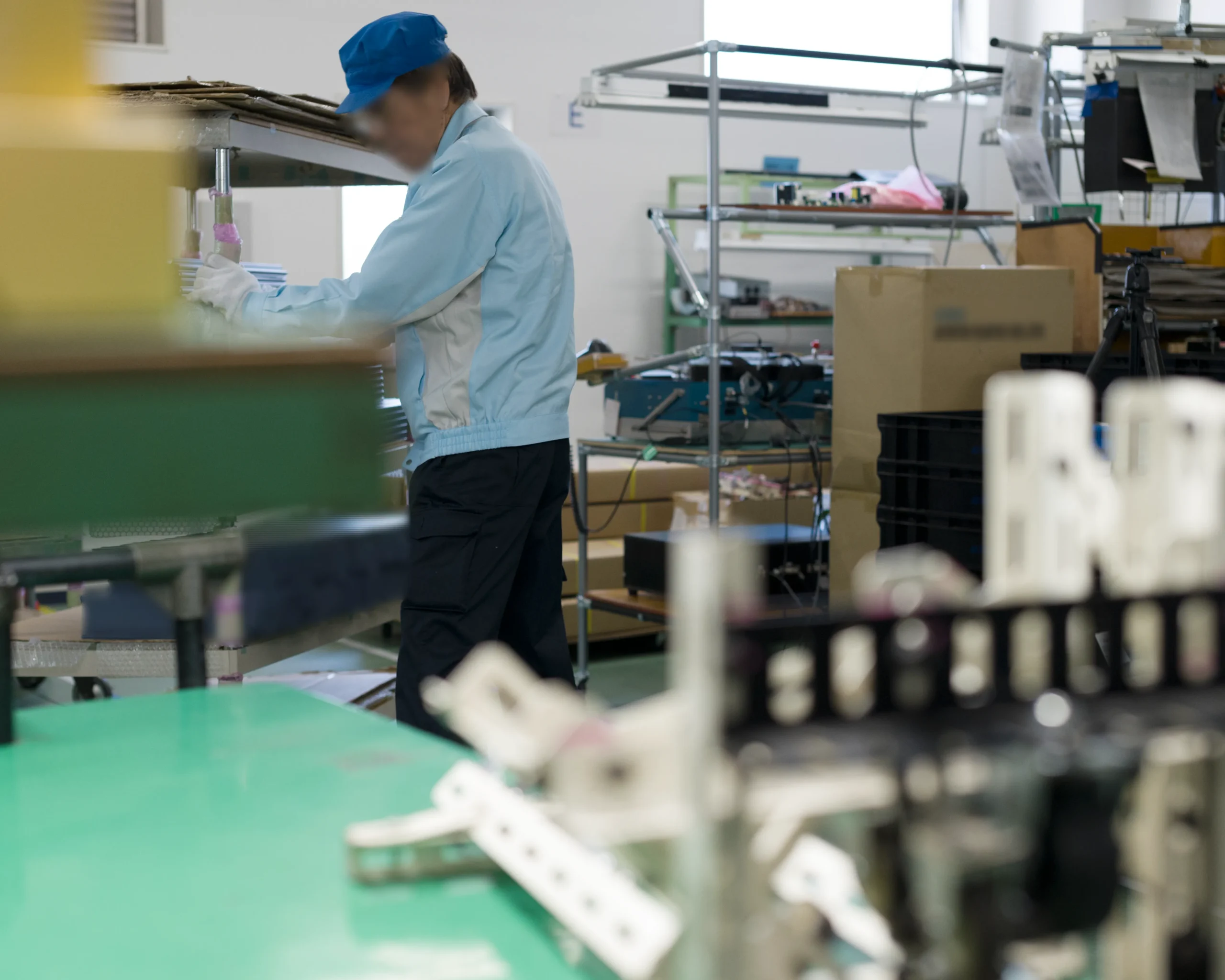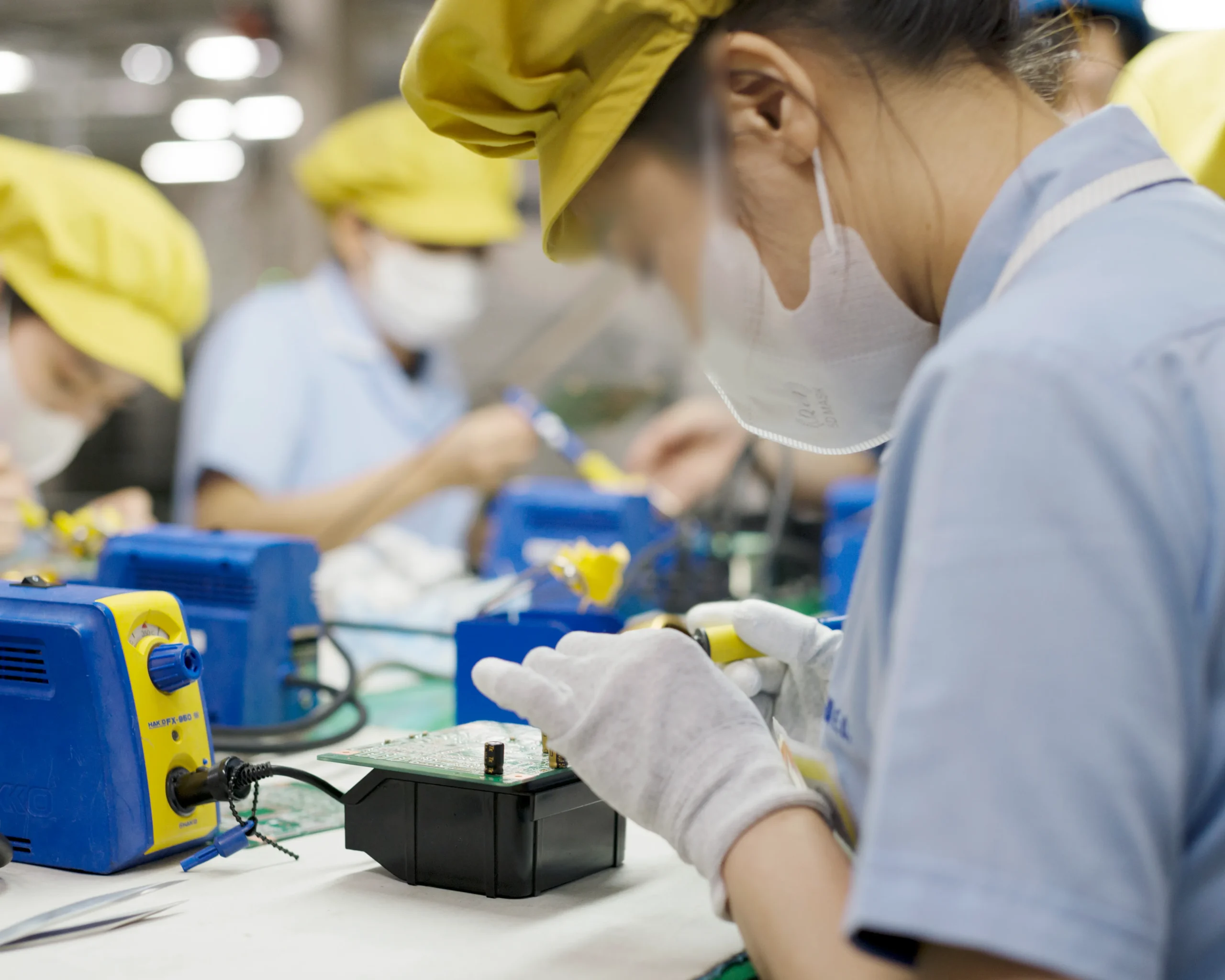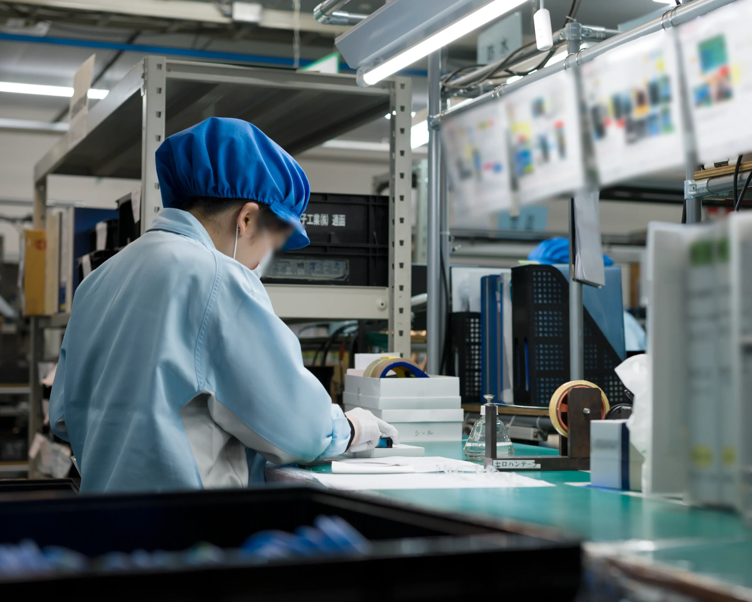 また、製造現場では従業員の健康管理とともに、プリント基板や電子部品の静電破壊にも気をつけています。