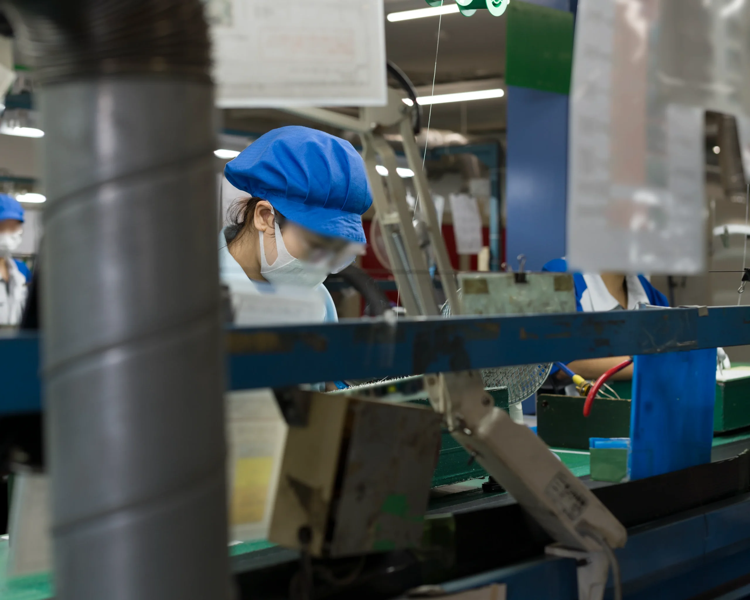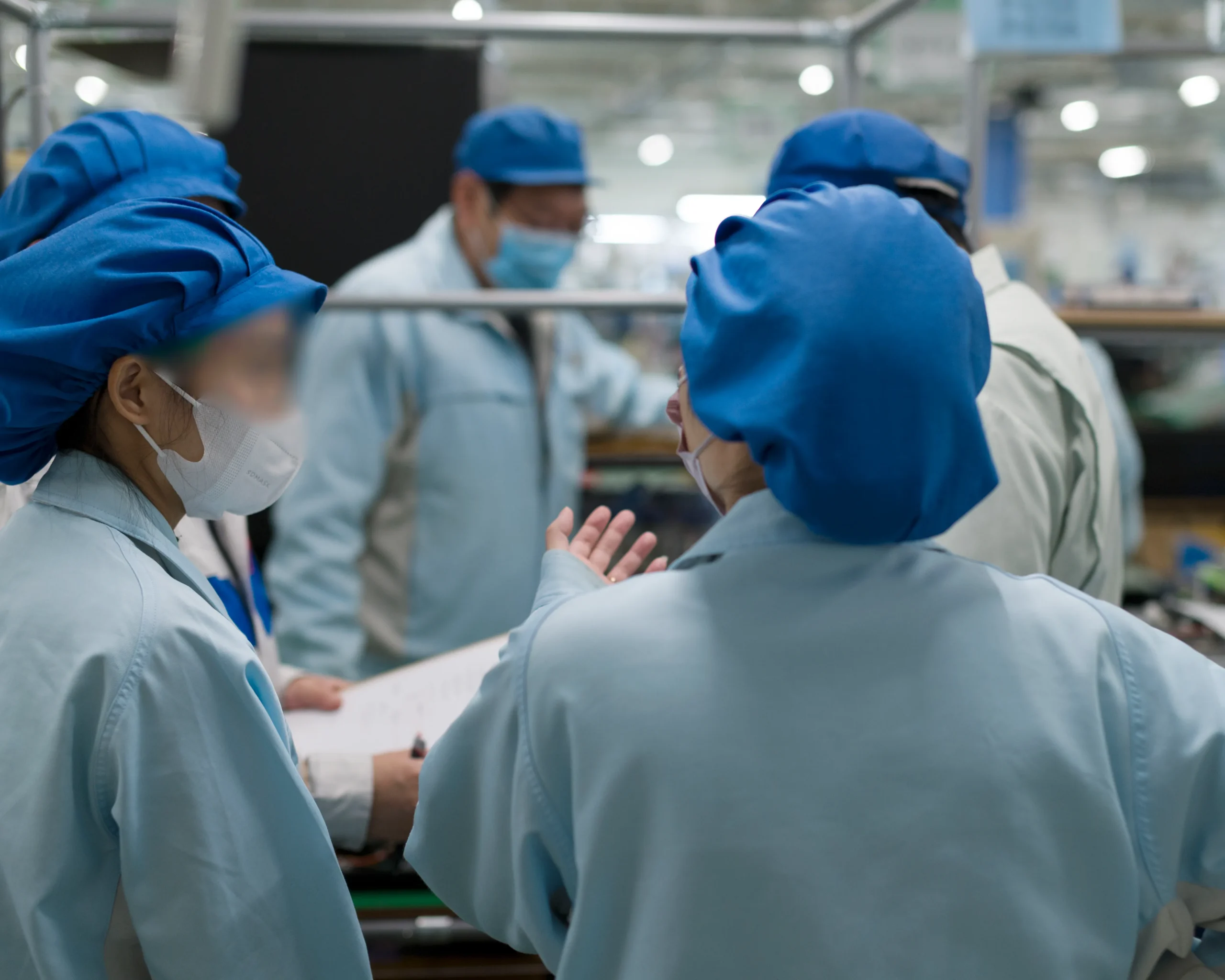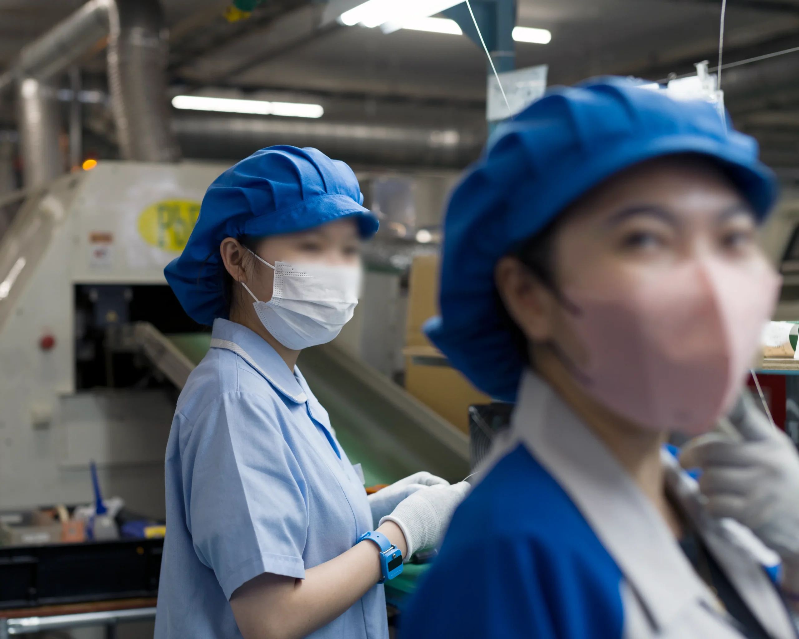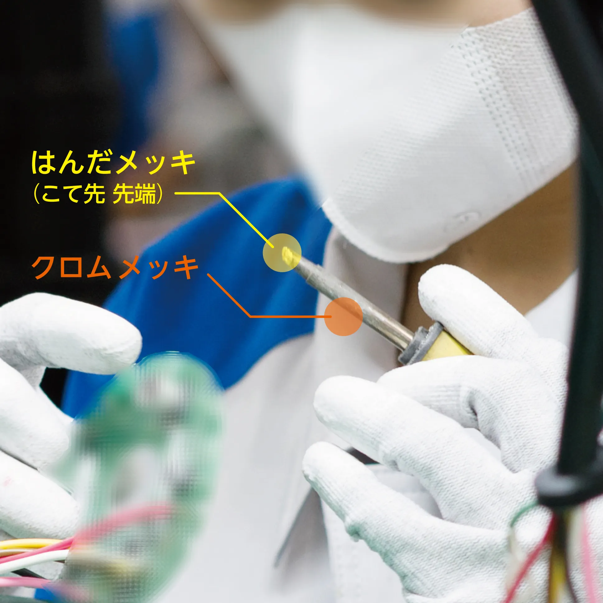 また、製造現場では従業員の健康管理とともに、プリント基板や電子部品の静電破壊にも気をつけています。