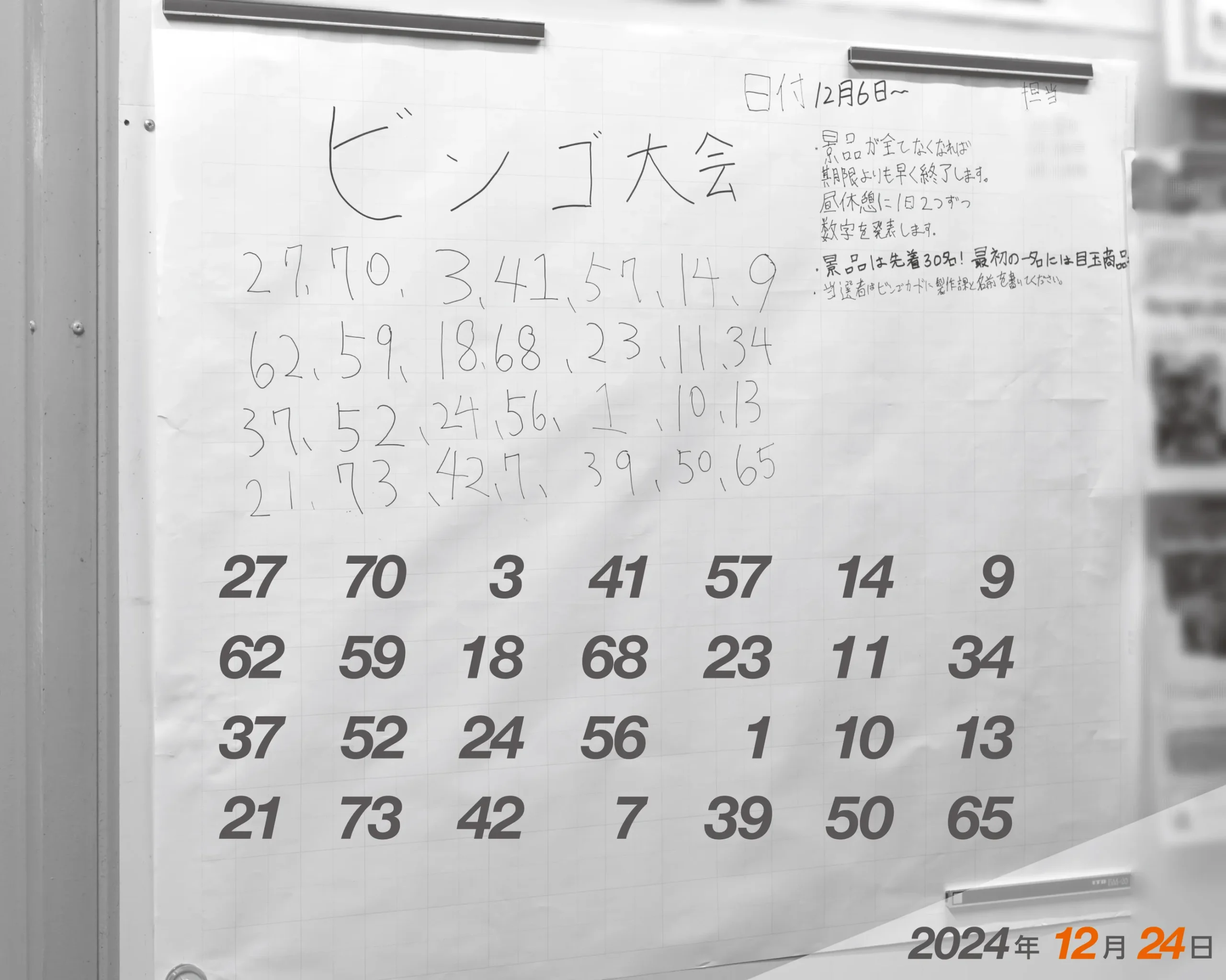 職場委員会が年末に毎年、ビンゴ大会を開催しています。昼休みに毎日、2つずつ抽せん数字が掲示されます。景品は、先着30人です。(2日目、2024/12/09)