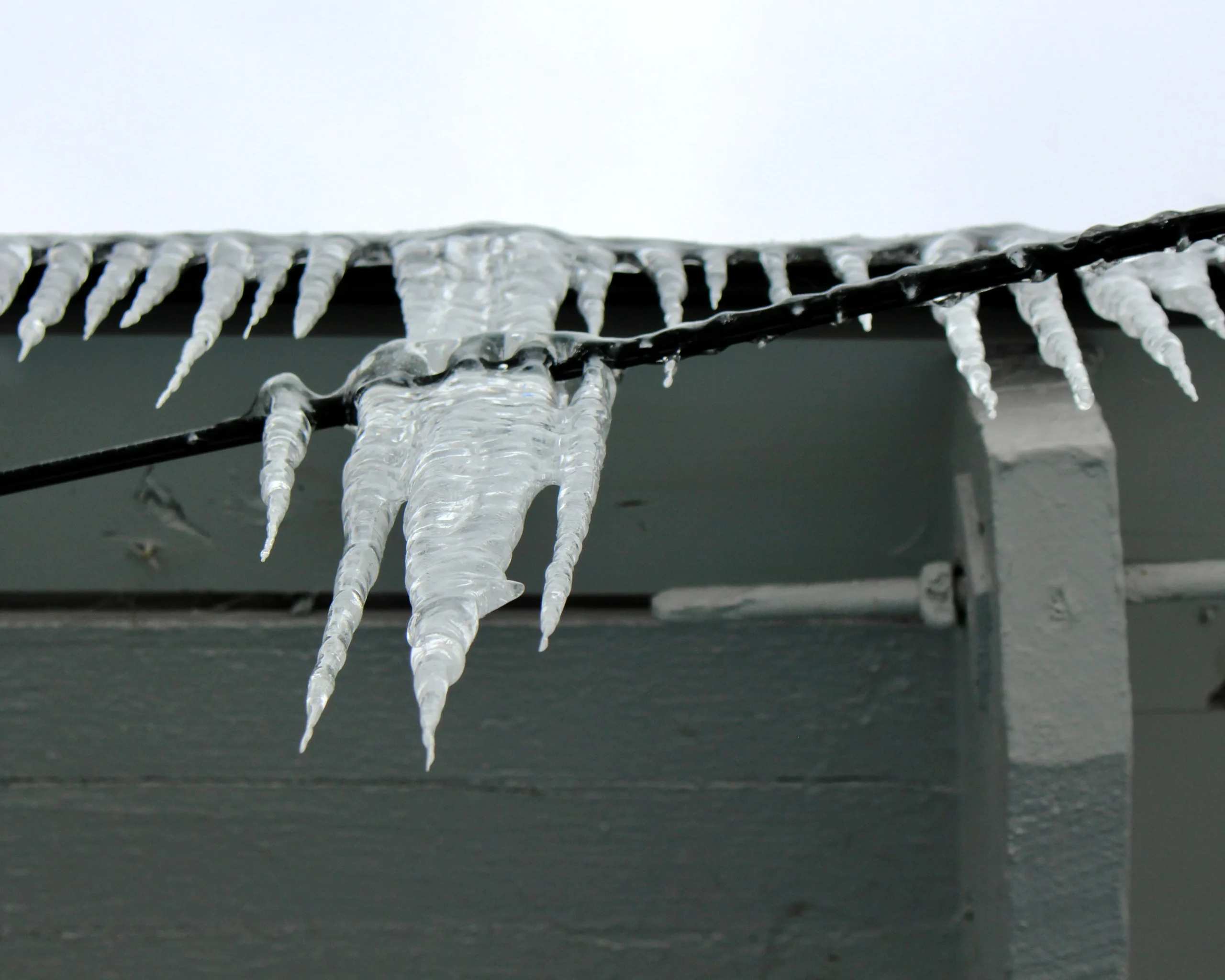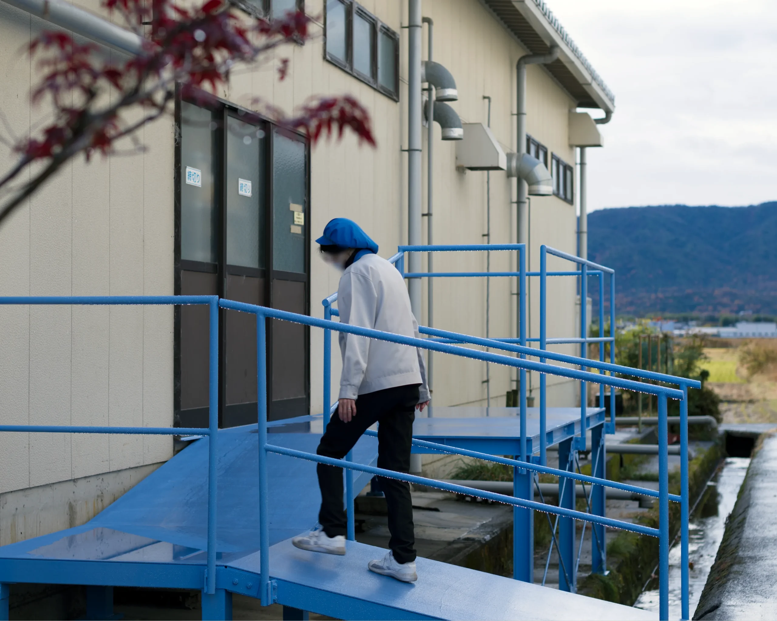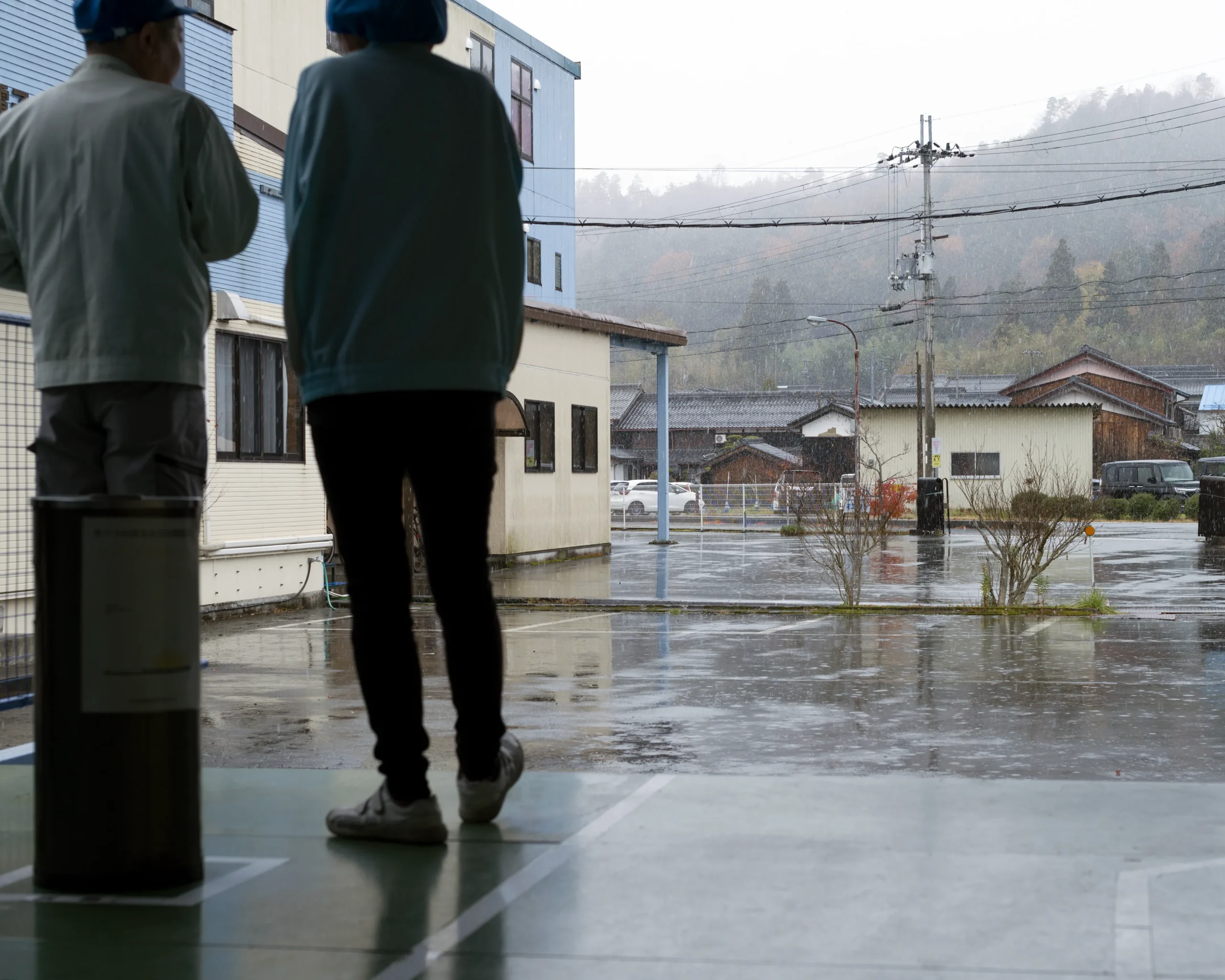 高島市は終日、雨やあられの予報です。氷雨を前にして、向かいの従業員が寒さでかじかんだ手を擦り合わせてあたためています。