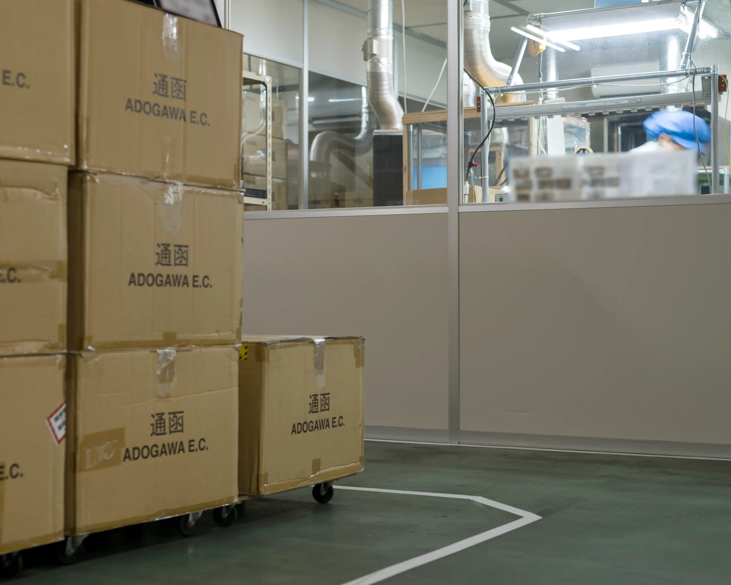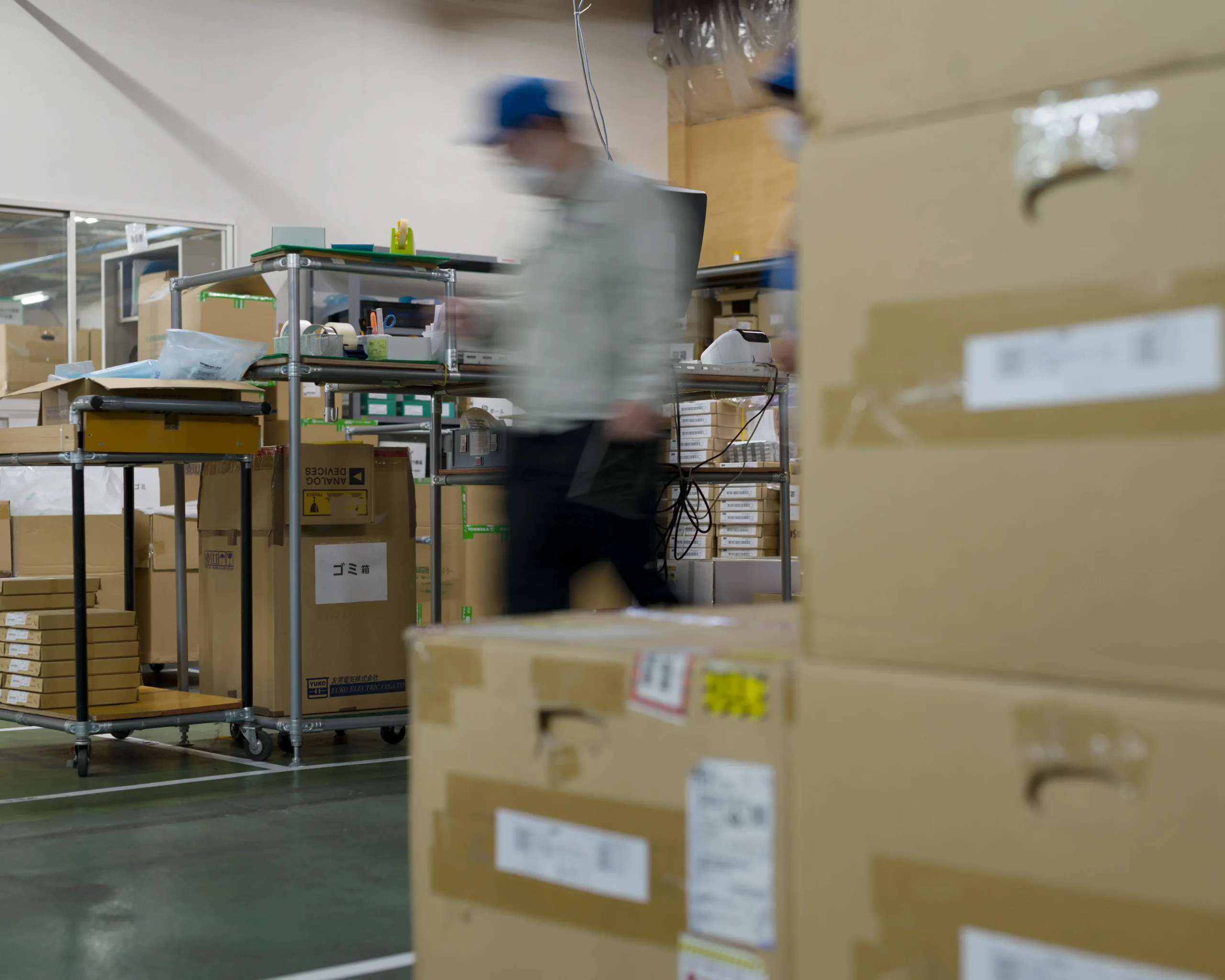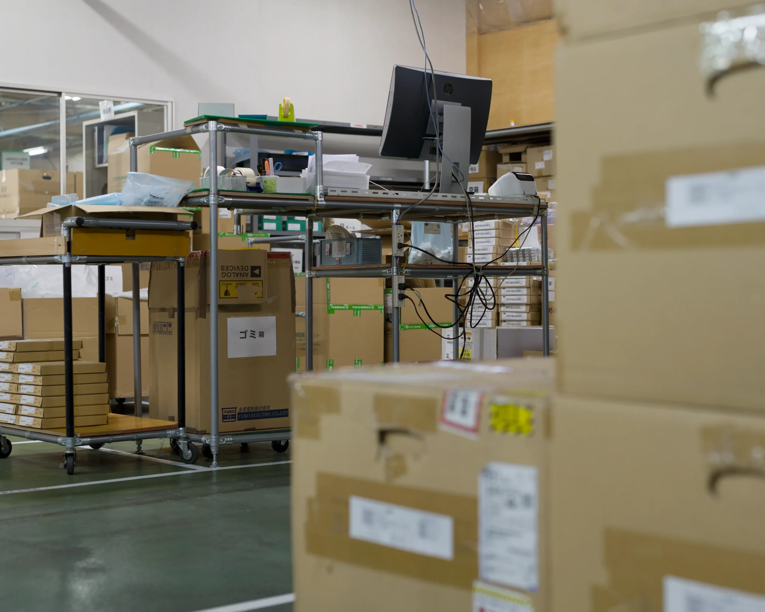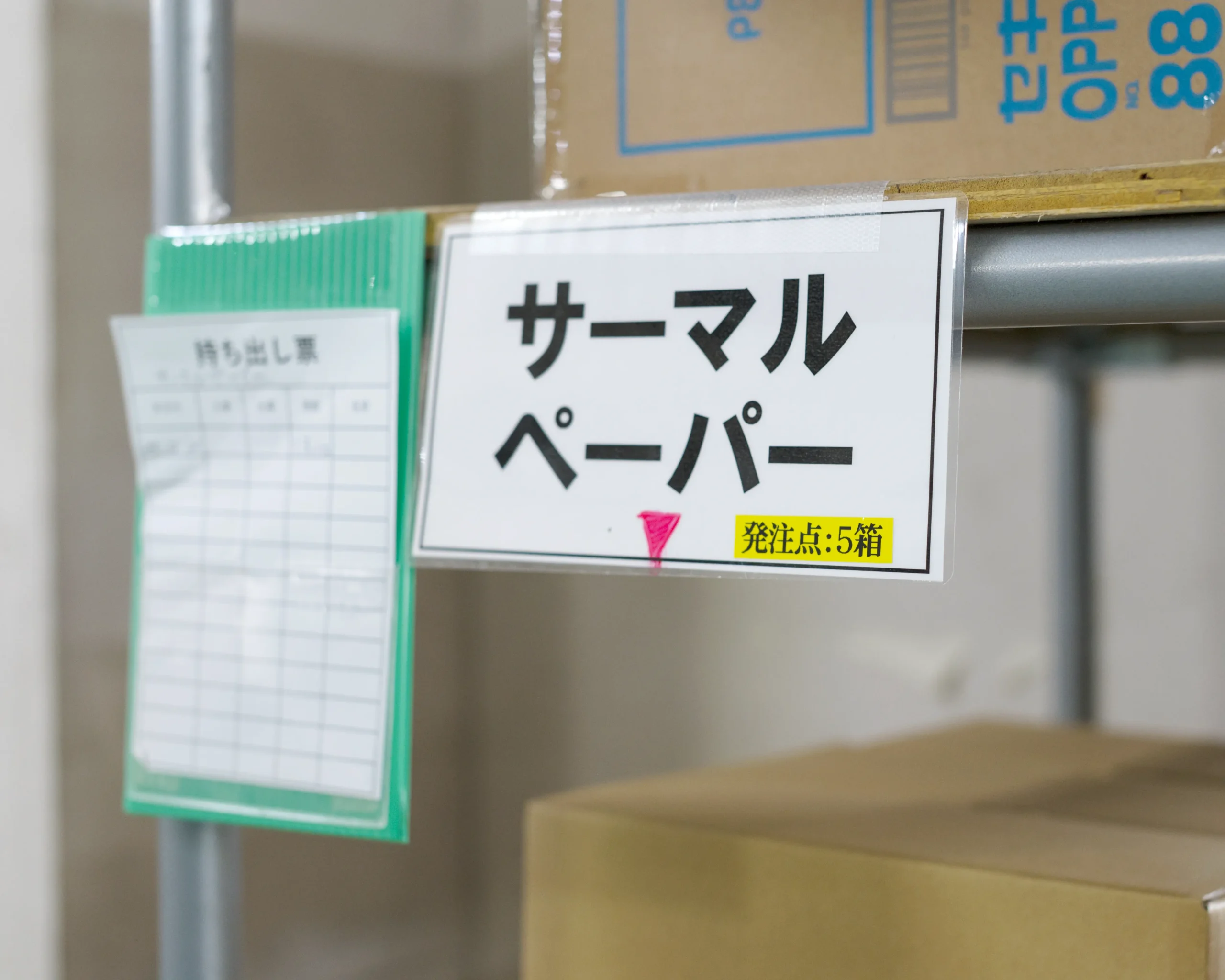 発注点(Ordering point)を、梱包テープやサーマルペーパーをはじめとする副資材に設けて在庫量を管理しています。
