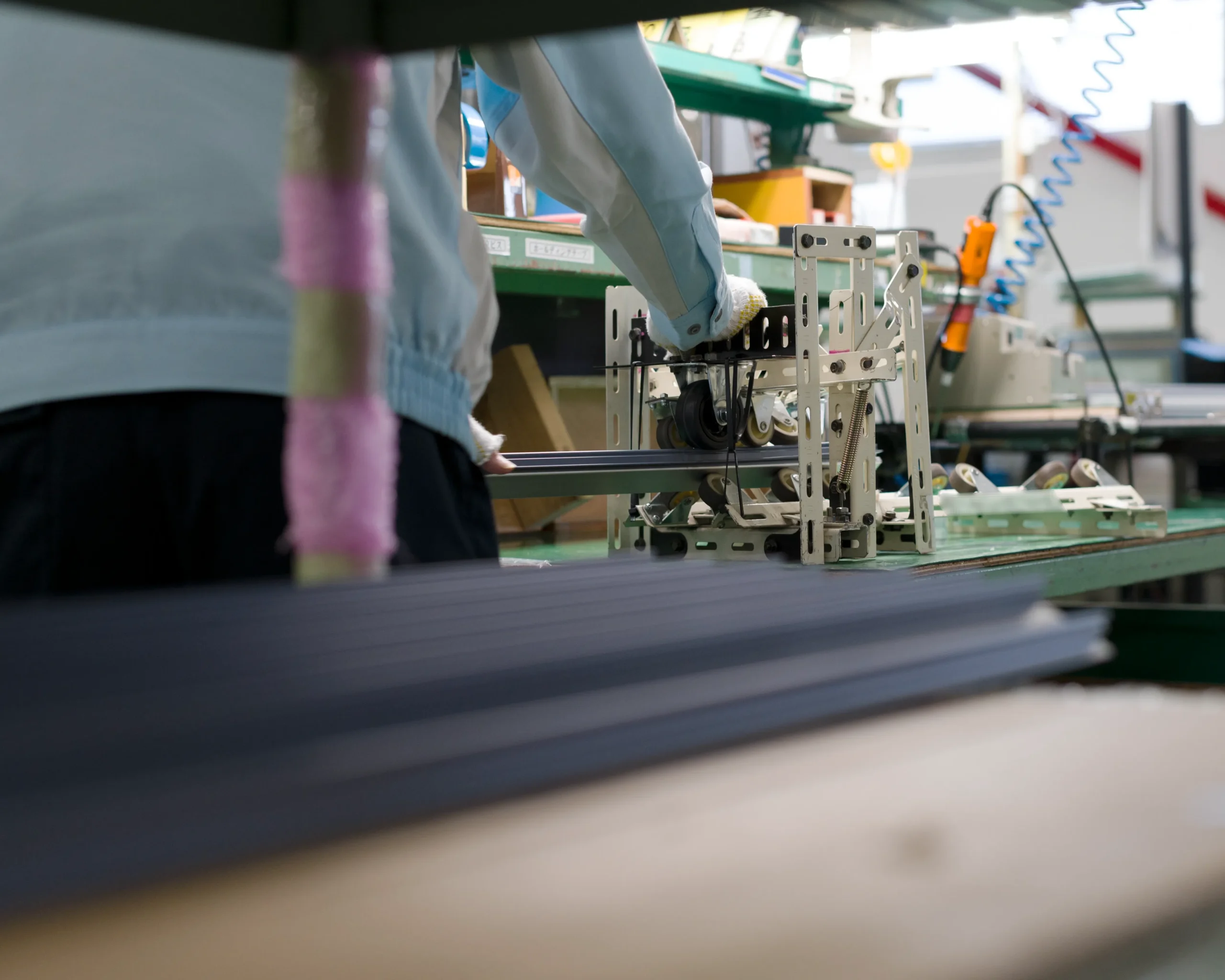 治具を制作する前は、樹脂カバーをダクトに、その長さに関わらず手で押し込んで取り付けていました。