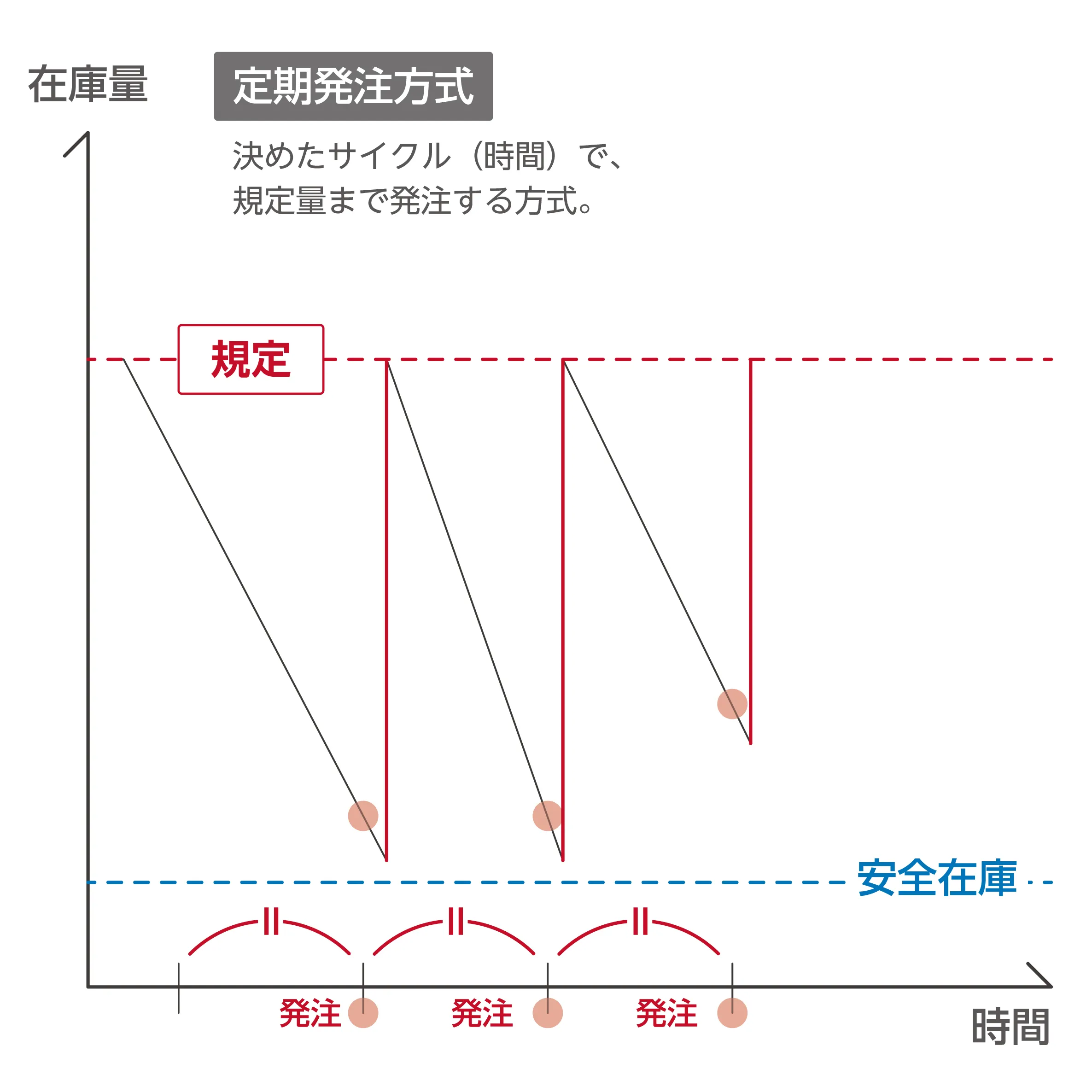 また定期発注方式は、決めたサイクル(時間)で、規定量まで発注する方式です。