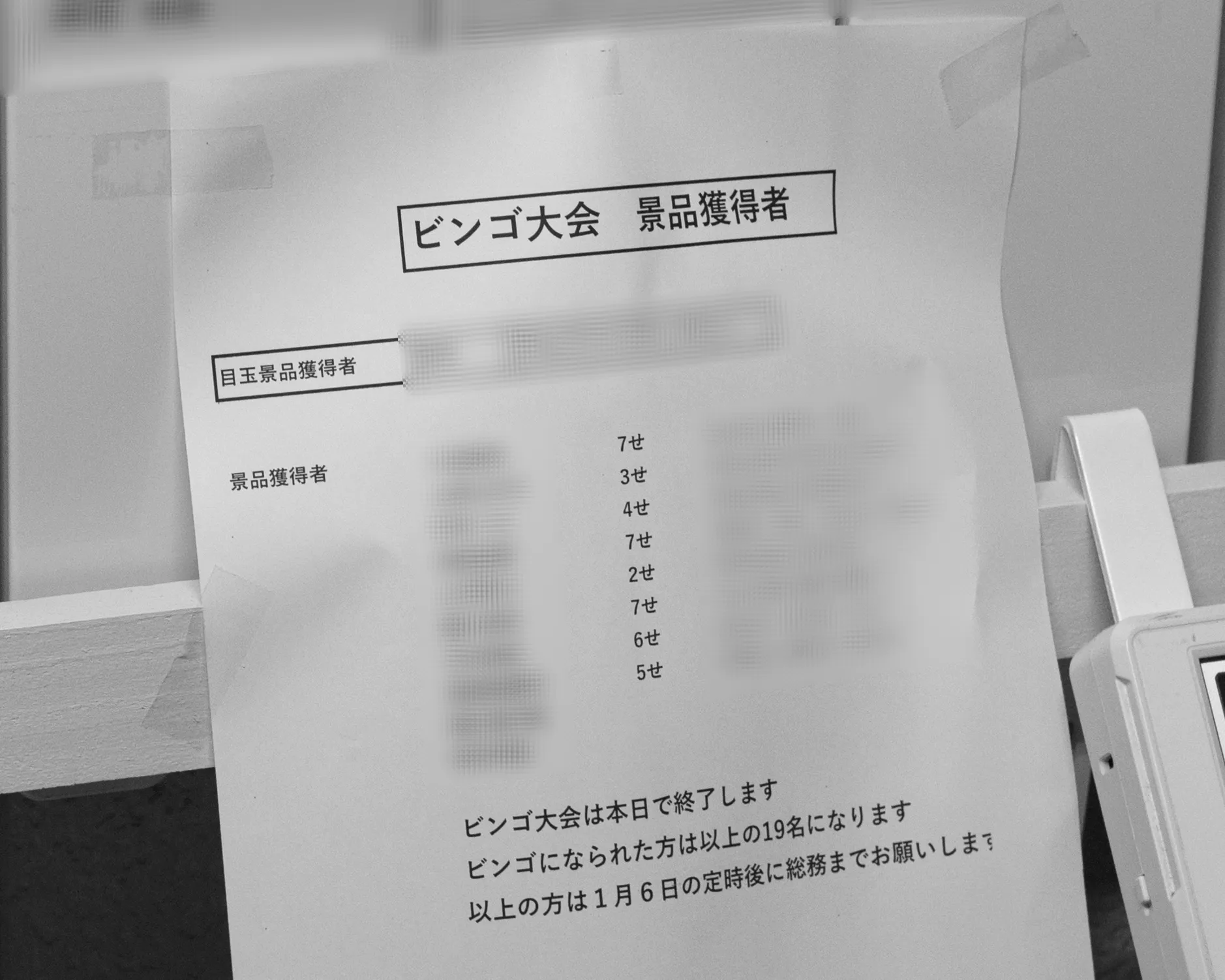 職場委員会が年末に毎年、ビンゴ大会を開催しており、その抽選結果が掲示されています。職場委員会の皆さん、おつかれさまでした。