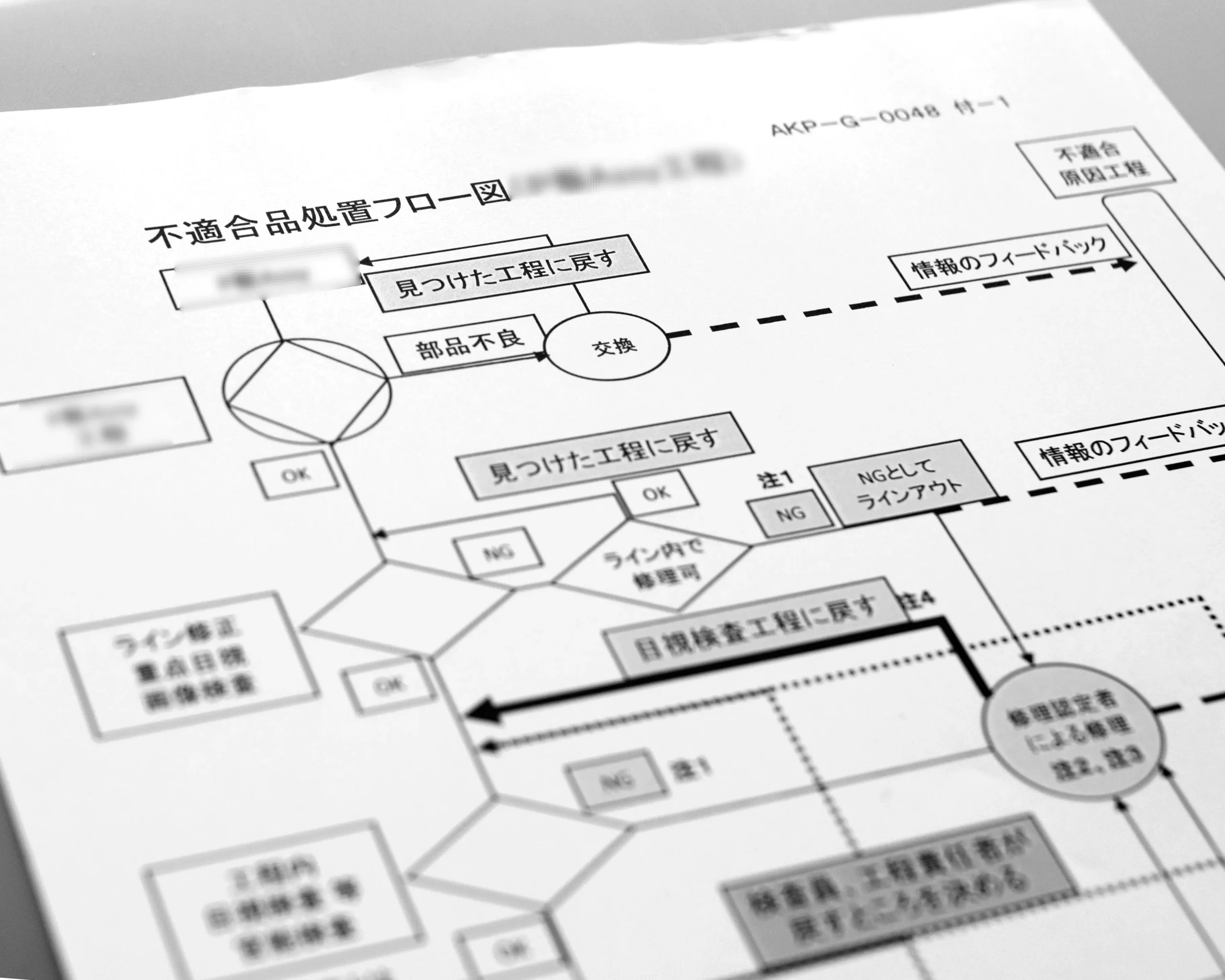 お客さまと取り決めた処置、管理ルールのもとに、不適合品処置フロー図を作成して見える化しています。