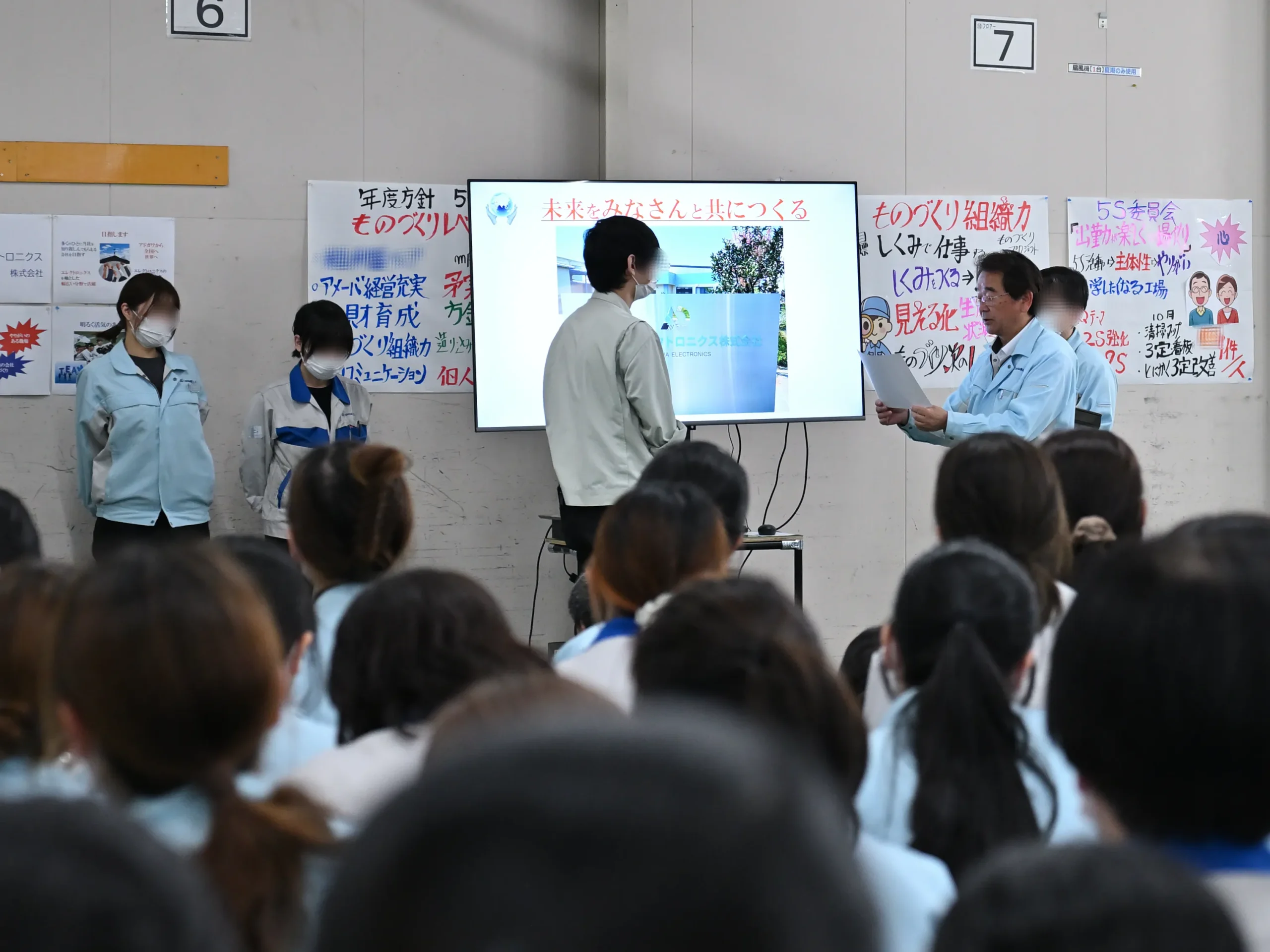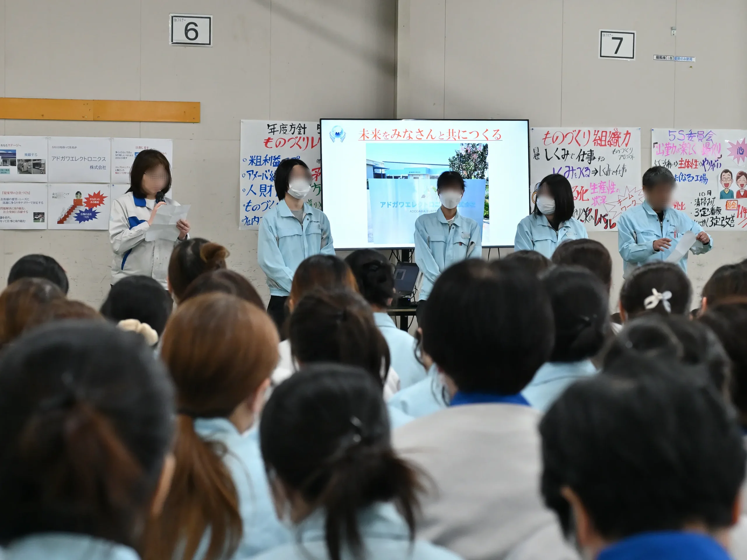 入社年数が3年〜25年の5名が、入社の経緯やアドガワエレクトロニクスをどんな会社にしたいかを主題に、思いを語りました。たとえば、IT(情報技術)革命が本格化し始めた2000年以降に入社して20年目を迎えた女性は、3歳だったお子さんの世話をしながら社内外の協力で今日まで働き続けられたことを。