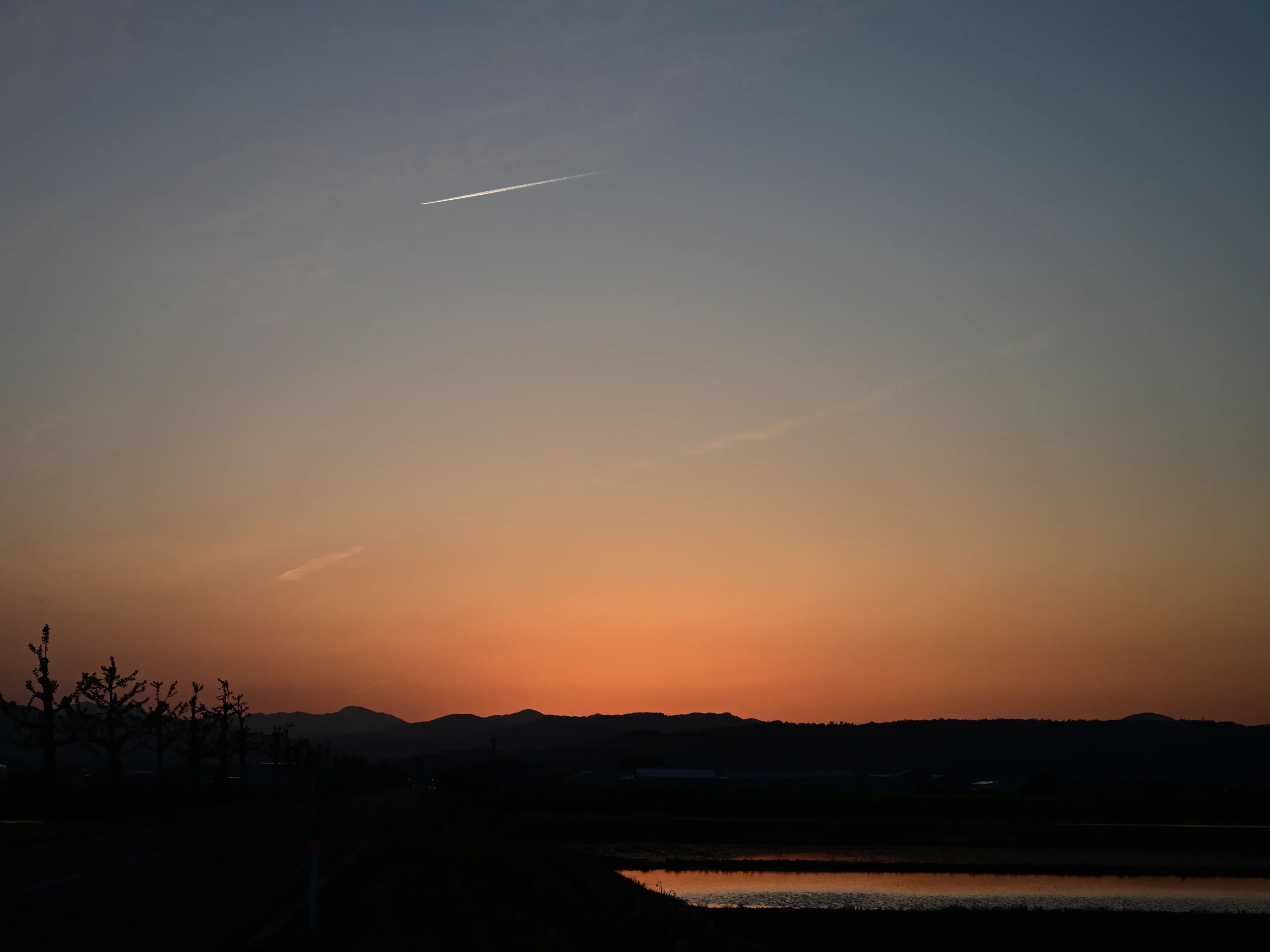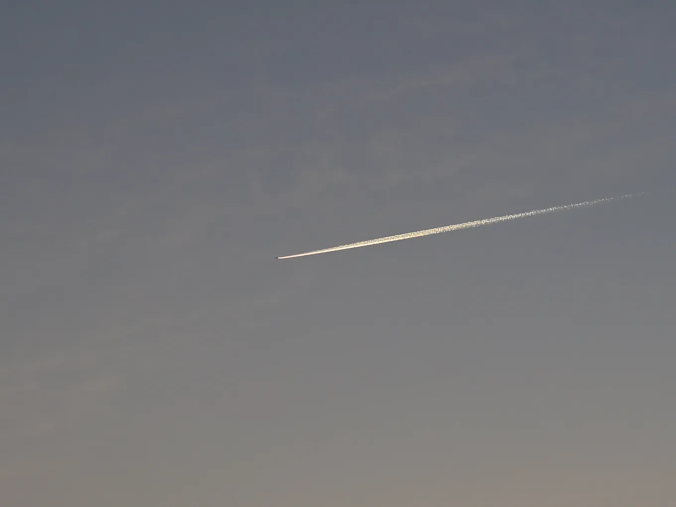 上空の空気が乾燥しているときの飛行機雲は、周囲の空気と混ざってすぐに消えます。飛行機雲がすぐに消える(飛行機雲が短い)ときは、晴れが続くことが多いようです。飛行機雲が写真のように長く伸びるのは、上空の空気が湿っているということで、翌日は天気が崩れるかもしれません。