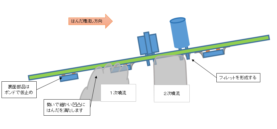 はんだを溶かして槽に満たしておき、その上に基板を通過させてはんだを噴き上げ接合する工程をフローはんだ工程といいます。