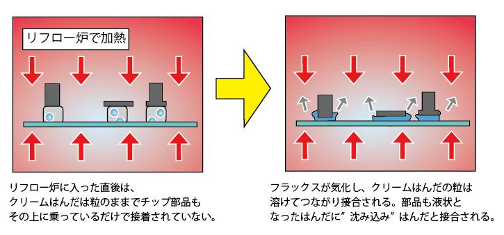 これをリフロー炉で加熱することで粒同士だった半田を接合し、フラックスも熱で気化させることで「通常のはんだと同じ状態にし」はんだ付けするというわけです。