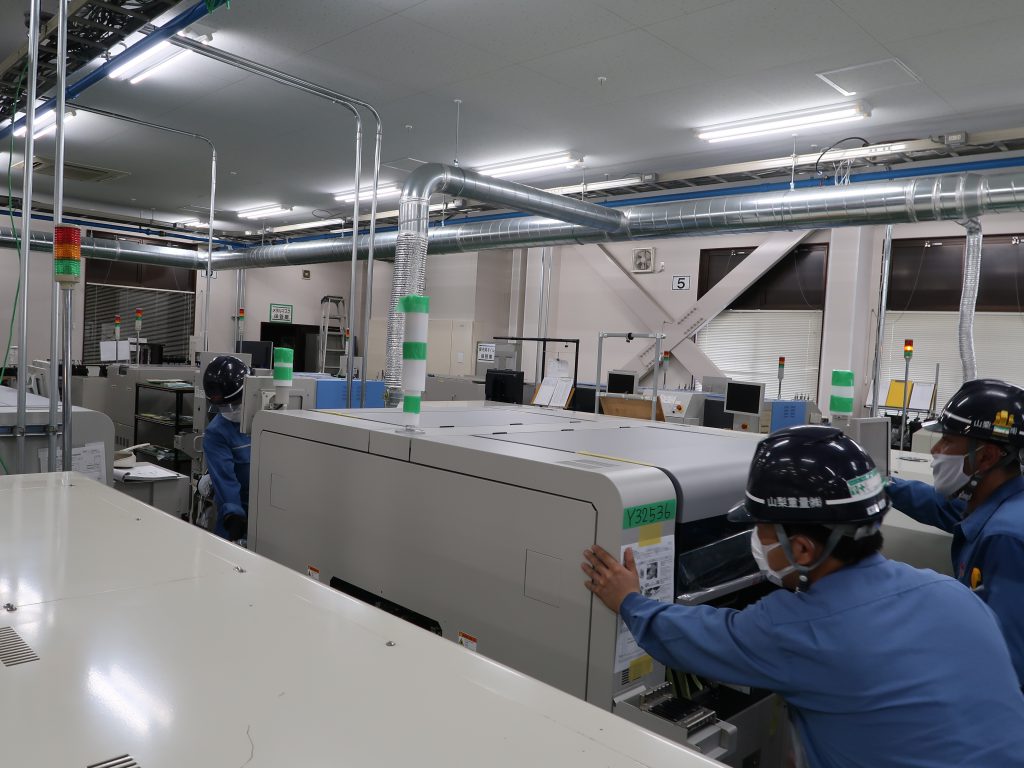 以下の写真は、表面実装ラインの間を縫って、マウンターを運んでいるところです。