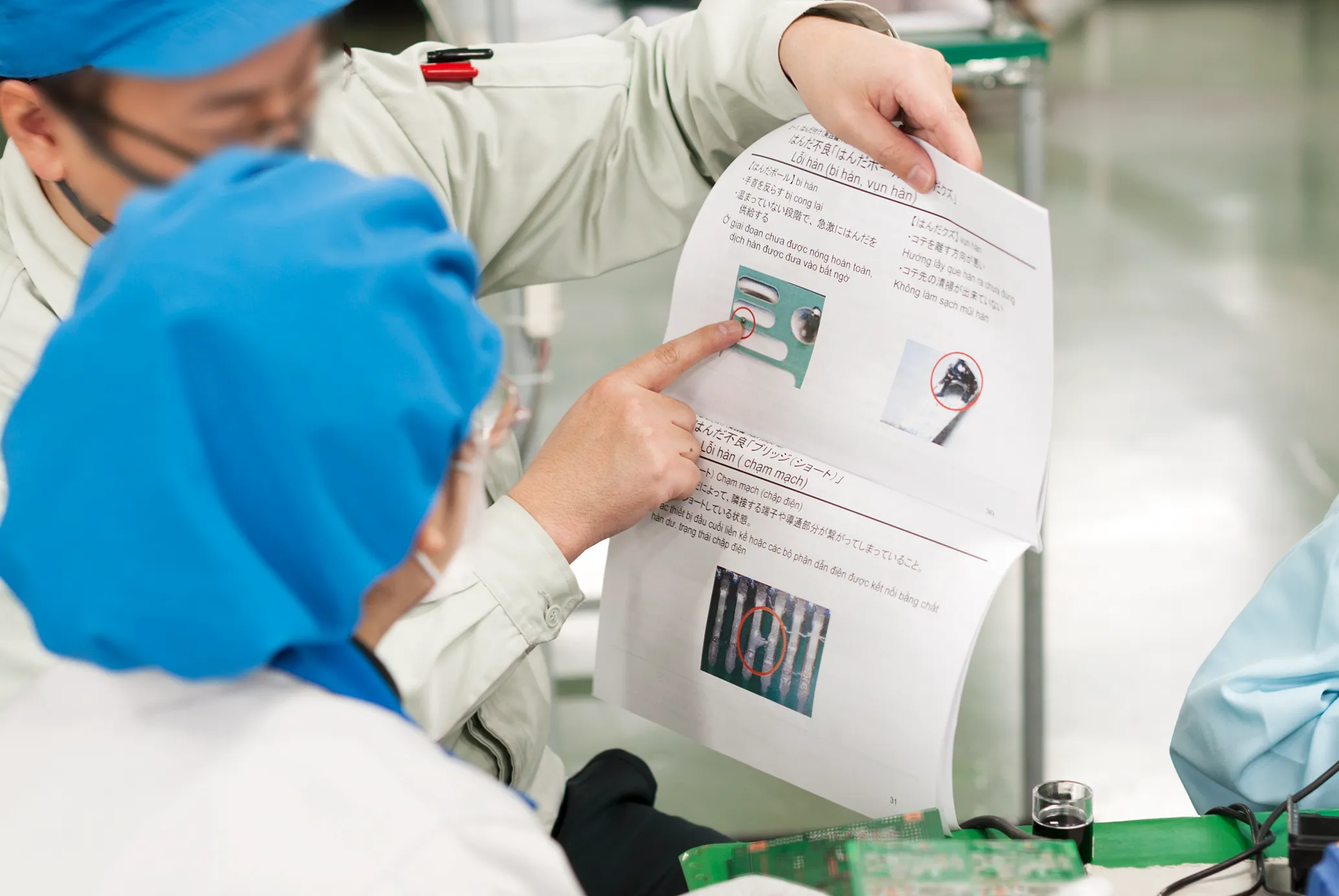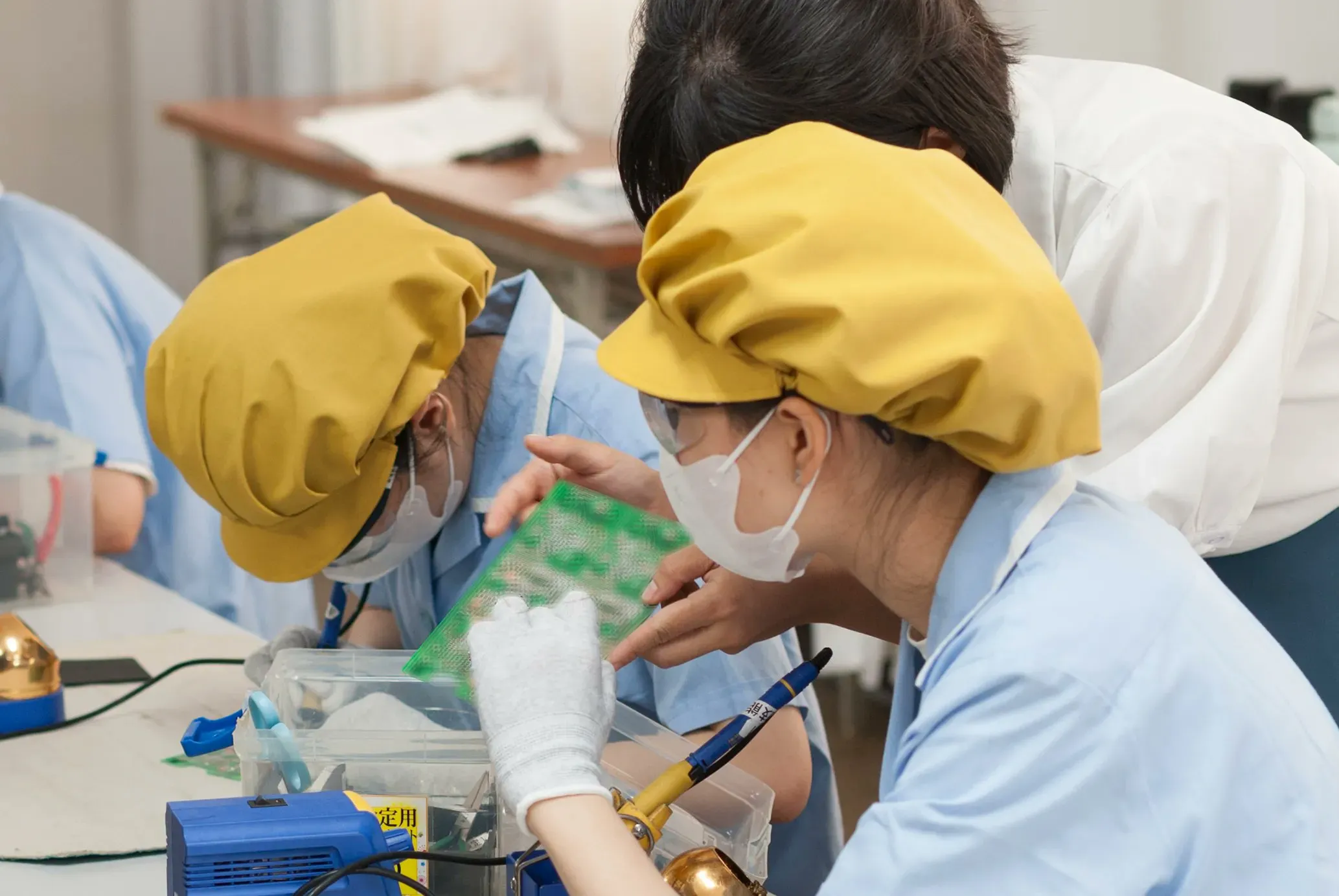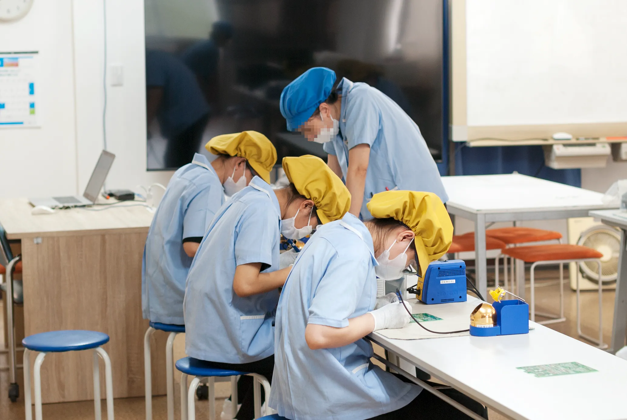 はんだ付けの練習風景です。テキストや動画素材、先輩の指導で教育を進めます。