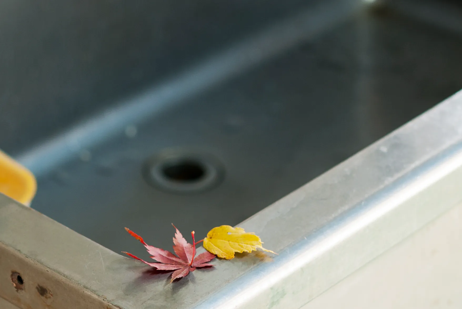 突然の雨風で渡り廊下はびしょびしょに。手洗い場のふちには風の悪戯か。