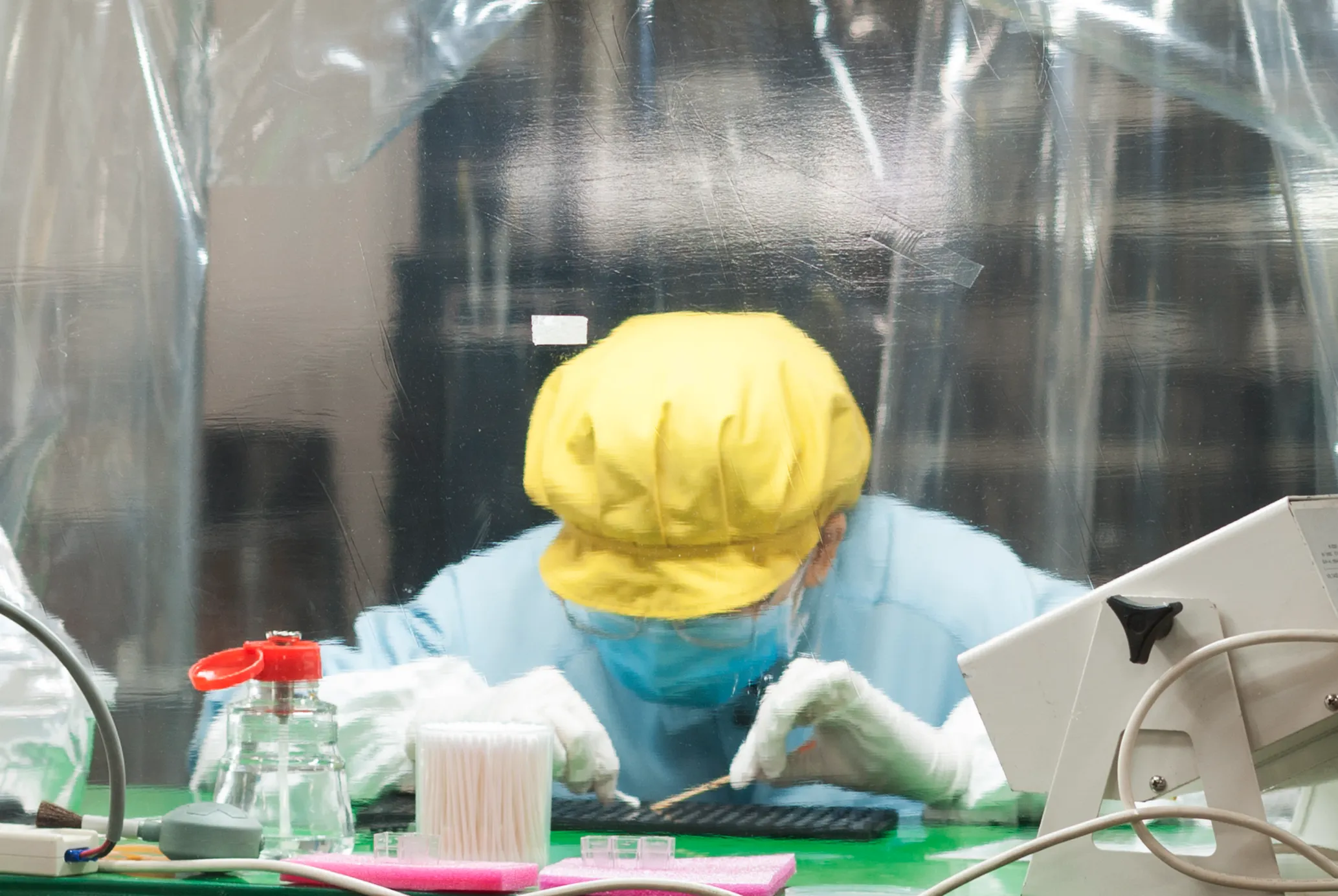 プロテクトフィルム工程を、簡易クリーンルームで実施しています。