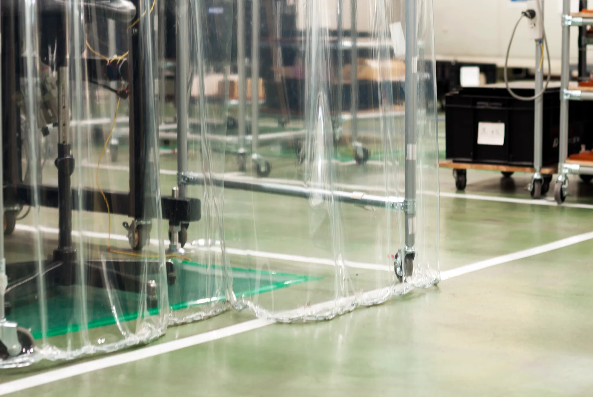 簡易クリーンルームは、品種切替、増減産時のレイアウト変更を容易にするため、キャスターを付けて工夫しています。
