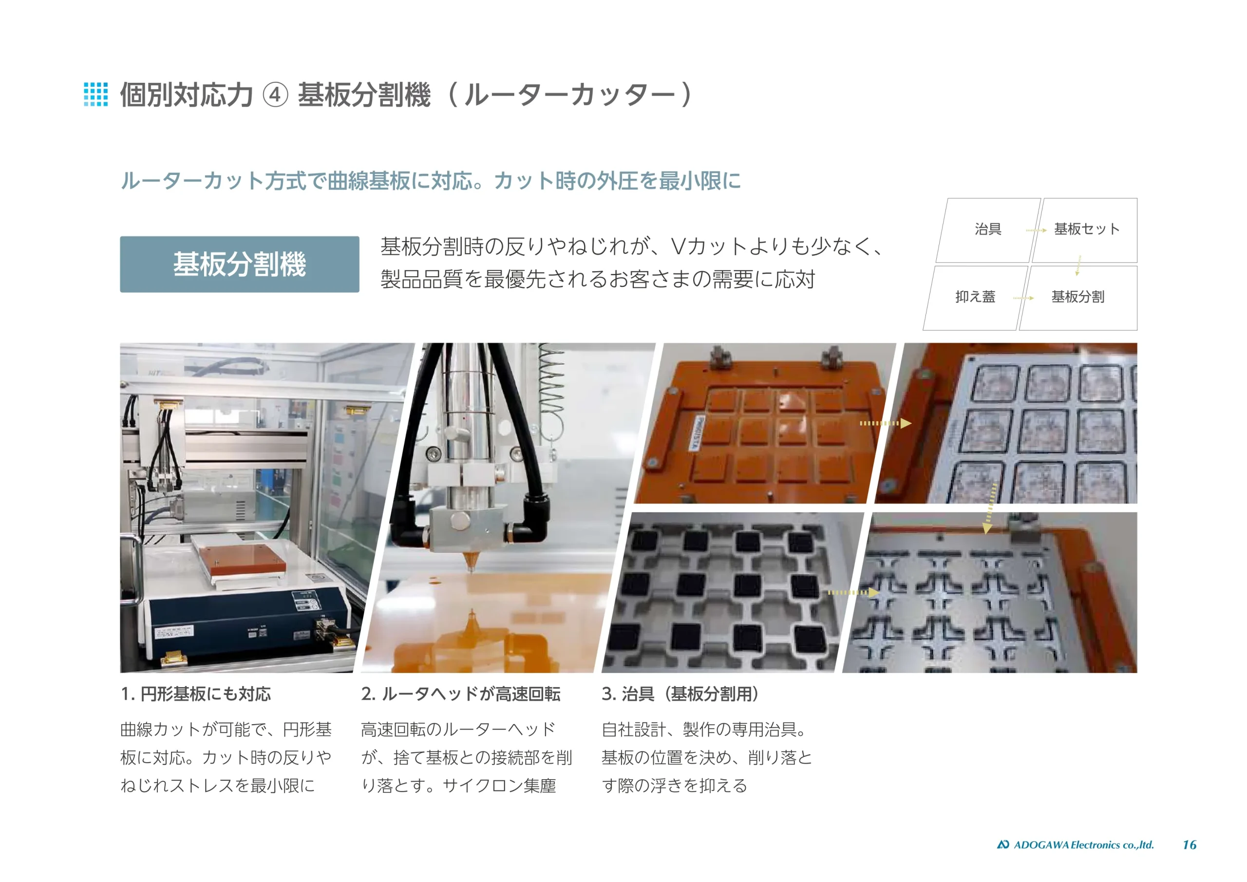 切り込み(Vカット)に沿って個々に分割しますが、分割時に、基板に反りやねじれが発生することも。