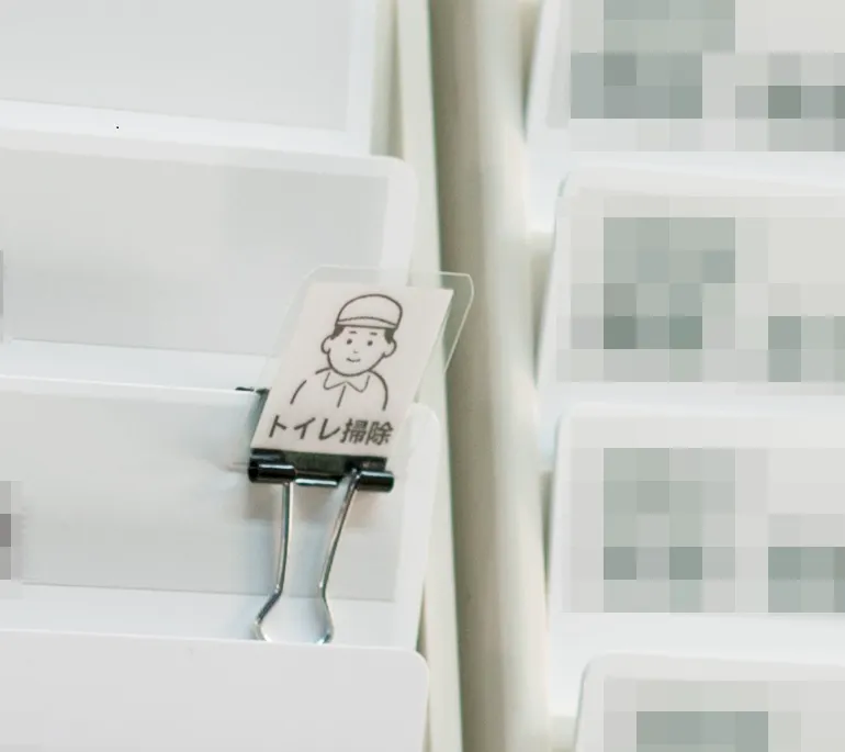 次の掃除担当への声かけはもちろん、忘れないようにタイムカードにダブルクリップを挟んで、見える化しています。