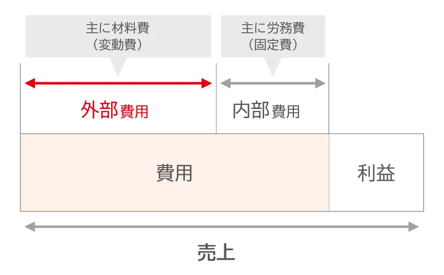 外部支払費である材料費が削減できれば、発注からすぐに原価削減の効果が見えます。費用を圧縮するためにはまず、製造ライン改善で作業の効率化を図ったり、従業員の残業代や電気代を減らしたりすることに目がいきがちですが、それよりも、費用の大部分を占める材料費(製造原価の半分以上)が削減できれば、企業の利益に直結します。