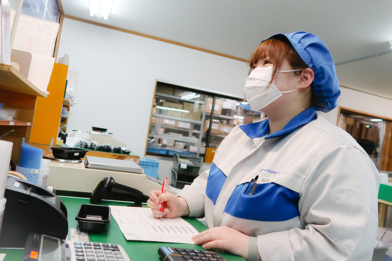 資材課では部品を保管する自動倉庫から注文いただいた部品を必要数量だけピッキングする仕事を担当しています。この仕事は自分の長所である、まじめで「コツコツ努力をする」「細かい作業が好き」をフルで活かせます。毎日チーム一丸となって、自分の仕事にもしっかりと責任を持ち業務にあたっています。